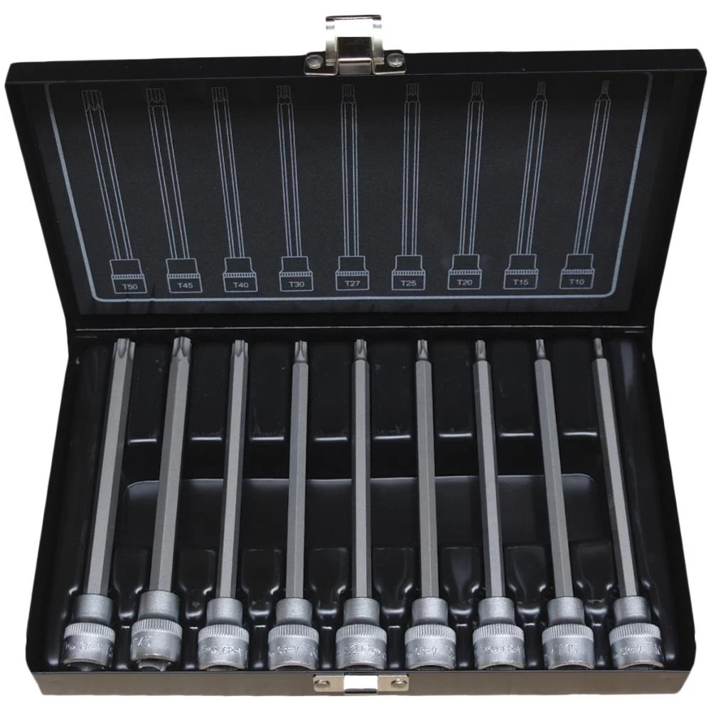 Stifttopsæt med 9 dele. Lange 3/8″ Torx stifttoppe: TX10-15-20-25-27-30-40-45-50. Leveres i metalboks.