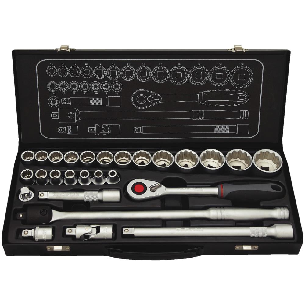 Topnøglesæt med 27 dele. 1/2″ korte 12kt toppe. Sættet indeholder: 8,0 – 9,0 – 10,0 – 11,0 – 12,0 – 13,0 – 14,0 – 15,0 – 16,0 – 17,0 – 18,0 – 19,0 – 21,0 – 22,0 – 24,0 – 27,0 – 30,0 – 32,0 – 34,0 – 36,0 mm, forlængere med Wobble hhv. 45, 125 og 250 mm, kardanled, 3/8″×1/2″ overgang, ledgreb og skraldenøgle med udløser. Leveres i metalboks.