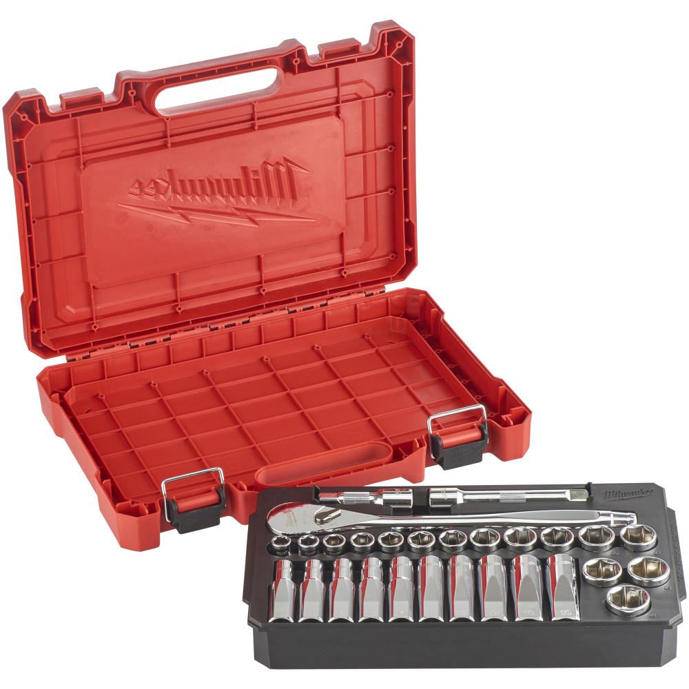 90-tands design med 4 graders kurve til når der arbejdes på trang plads. Udtagbart beholder gør den let at opbevare. Toppene er stemplet med mål på den flade side for let identifikation. Konstruktion i fuldmetal for øget holdbarhed. 4 flade sider forhindrer toppene i at trille. Slank hovedprofil for lettere adgang. Sættet indeholder standard toppe: 10 mm, 11 mm, 12 mm, 13 mm, 14 mm, 15 mm, 16 mm, 17 mm, 18 mm, 19 mm, 20 mm, 21 mm, 22 mm, 23 mm, 24 mm. Dybe toppe i størrelserne 10 mm, 11 mm, 12 mm, 13 mm, 14 mm, 15 mm, 16 mm, 17 mm, 18 mm, 19 mm samt 3″ forlænger, 5″ forlænger og udtagbar opbevaringsbakke.