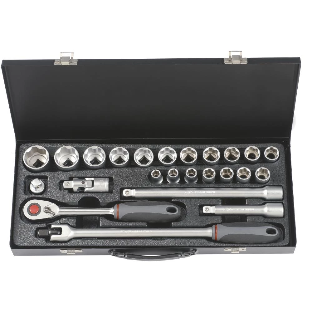 Topnøglesæt med 24 dele. 1/2″ 6kt korte toppe. Sættet indeholder: 10,0 – 11,0 – 12,0 – 13,0 – 14,0 – 15,0 – 16,0 – 17,0 – 18,0 – 19,0 – 21,0 – 22,0 – 24,0 – 27,0 – 30,0 – 32,0 mm, forlængere med Wobble hhv. 125 og 250 mm, kardanled, ledgreb og skraldenøgle med udløser. Leveres i metalboks.