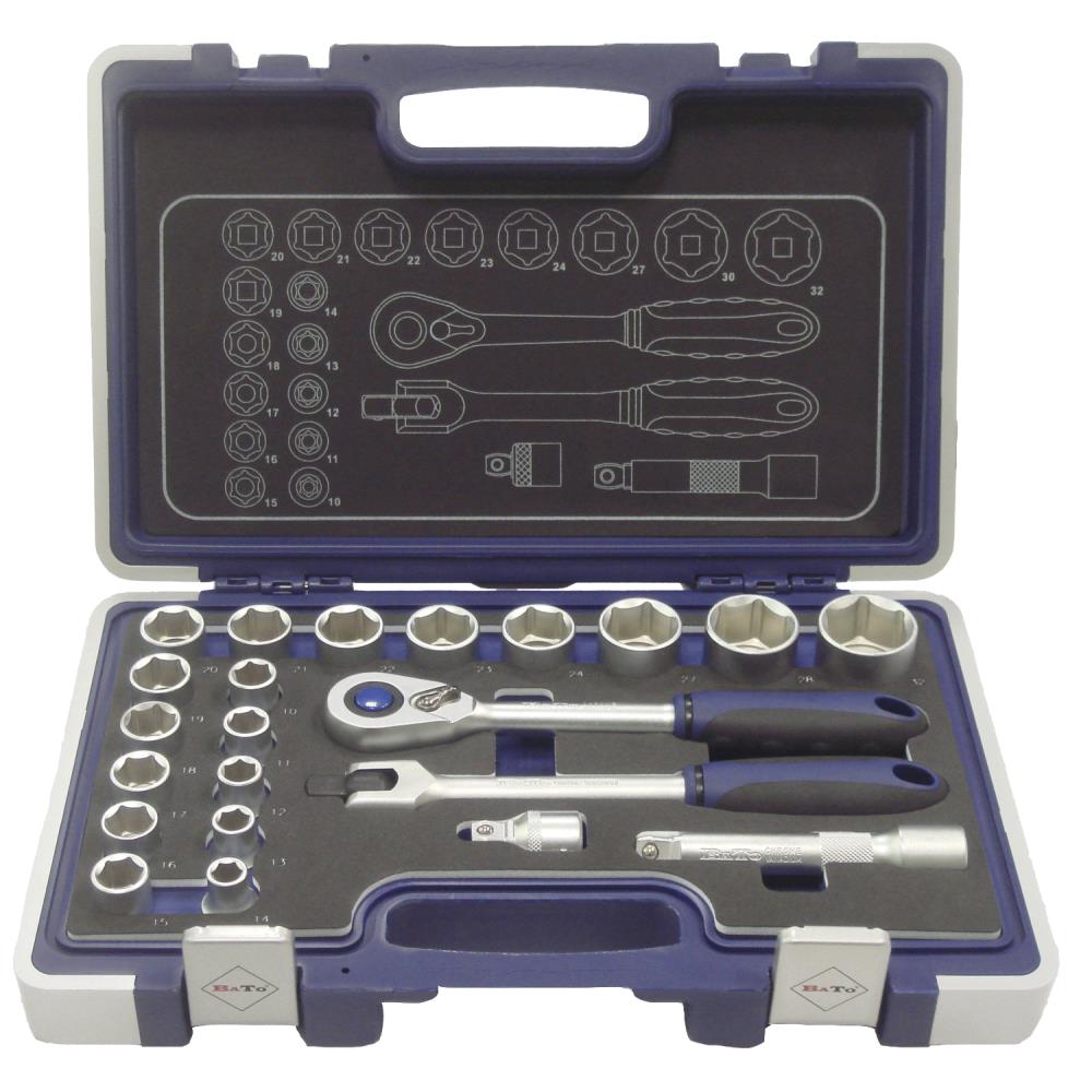 Topnøglesæt med 23 dele. 1/2″ 6kt korte EasyDrive toppe. Sættet indeholder: 10,0 – 11,0 – 12,0 – 13,0 – 14,0 – 15,0 – 16,0 – 17,0 – 18,0 – 19,0 – 21,0 – 22,0 – 24,0 – 27,0 – 30,0 – 32,0 mm, forlængere med Wobble hhv. 45 og 125 mm, ledgreb og skraldenøgle med udløser. Leveres i kraftig plastboks.