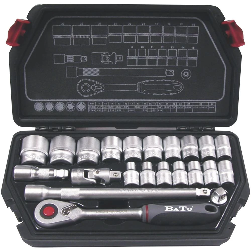Topnøglesæt med 22 dele. 1/2″ korte SplineLock toppe. Sættet indeholder: 8,0 – 10,0 – 11,0 – 12,0 – 13,0 – 14,0 – 15,0 – 16,0 – 17,0 – 18,0 – 19,0 – 21,0 – 22,0 – 24,0 – 27,0 – 30,0 – 32,0 mm, forlængere med Wobble hhv. 45 og 125 mm, kardanled, T-glider samt skraldenøgle med udløser. Leveres i kraftig plastboks.