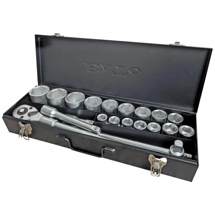 3/4″ topnøglesæt med 20 dele: Toppe kort 19-21-22-23-24-26-27-30-32-34-36-38-41-46-48-50 mm, 200 og 400 mm forlængere, T-glider 500 mm samt skraldenøgle. Leveres i metalkuffert.