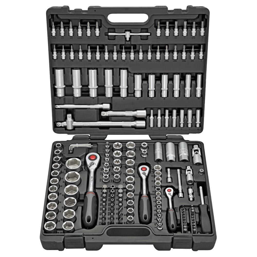 Komplet topnøglesæt med 171 dele. Kombisættet indeholder: korte 1/4″ toppe (4,0 – 4,5 – 5,0 – 5,5 – 6,0 – 7,0 – 8,0 – 9,0 – 10,0 – 11,0 – 12,0 – 13,0 – 14,0 mm), lange 1/4″ toppe (4,0 – 5,0 – 6,0 – 7,0 – 8,0 – 9,0 – 10,0 mm), 1/4″ E-toppe (4 – 5 – 6 – 7 – 8), 1/4″ bitstoppe (6kt 3,0 – 4,0 – 5,0 – 6,0 mm, Torx TX8 – TX9 – TX10 – TX15 – TX20 – TX25 – TX27 – TX30, Torx med hul TX8 – TX9 – TX10 – TX15 – TX20 – TX25 – TX27 – TX30, lige kærv 4,0 – 5,5 – 6,5 – 7,0 mm, Phillips PH0 – PH1 – PH2, Pozidriv PZ0 – PZ1 – PZ2), 1/4″ forlænger 50-100 mm, 1/4″ kardanled, 1/4″ skruetrækkerhåndtag, 1/4″ T-greb, 1/4″ skraldenøgle, korte 3/8″ toppe (10,0 – 11,0 – 12,0 – 13,0 – 14,0 – 15,0 – 16,0 – 17,0 – 18,0 – 19,0 mm), lange 3/8″ toppe (10,0 – 11,0 – 12,0 – 13,0 – 14,0 – 15,0 mm), 3/8″ E-toppe (10 – 11 – 12 – 14 – 16 – 18), 3/8″ tændrørstoppe (18 mm), 3/8″ forlænger 150 mm, 3/8″ kardanled, 3/8″ skraldenøgle, korte 1/2″ toppe (10,0 – 11,0 – 12,0 – 13,0 – 14,0 – 15,0 – 16,0 – 17,0 – 18,0 – 19,0 – 20,0 – 21,0 – 22,0 – 24,0 – 27,0 – 30,0 – 32,0 mm), lange 1/2″ toppe (16,0 – 17,0 – 18,0 – 19,0 – 22,0 mm), 1/2″ tændrørstoppe (16-22 mm), 1/2″ forlænger 125-250 mm, 1/2″ kardanled, 1/2″ T-glider, 1/2″ skraldenøgle, bitsadapter (1/2″×5/16″, 1/4″×1/4″, 1/2″×1/4″, 3/8″×1/4″), 5/16″ bits (lige kærv 8,0 – 10,0 – 12,0 mm, Phillips PH3 – PH4, Pozidriv PZ3 – PZ4, 6kt 7,0 – 8,0 – 10,0 – 12,0 – 14,0 mm, Torx TX40 – TX45 – TX50 – TX55 – TX60 -TX70, Torx med hul TX40 – TX50 – TX55 – TX60 – TX70), 1/4″ bits (Torx TX5 – TX6 – TX7, XZN 5 – 6 – 8, Fivestar 10 – 15 – 20 – 25 – 27 – 30 – 40 – 45, Ribe 5 – 6 – 7 – 8 – 9), Stiftnøgler 1,0 – 1,5 – 2,0 – 2,5 – 3,0 – 4,0 – 5,0 mm.