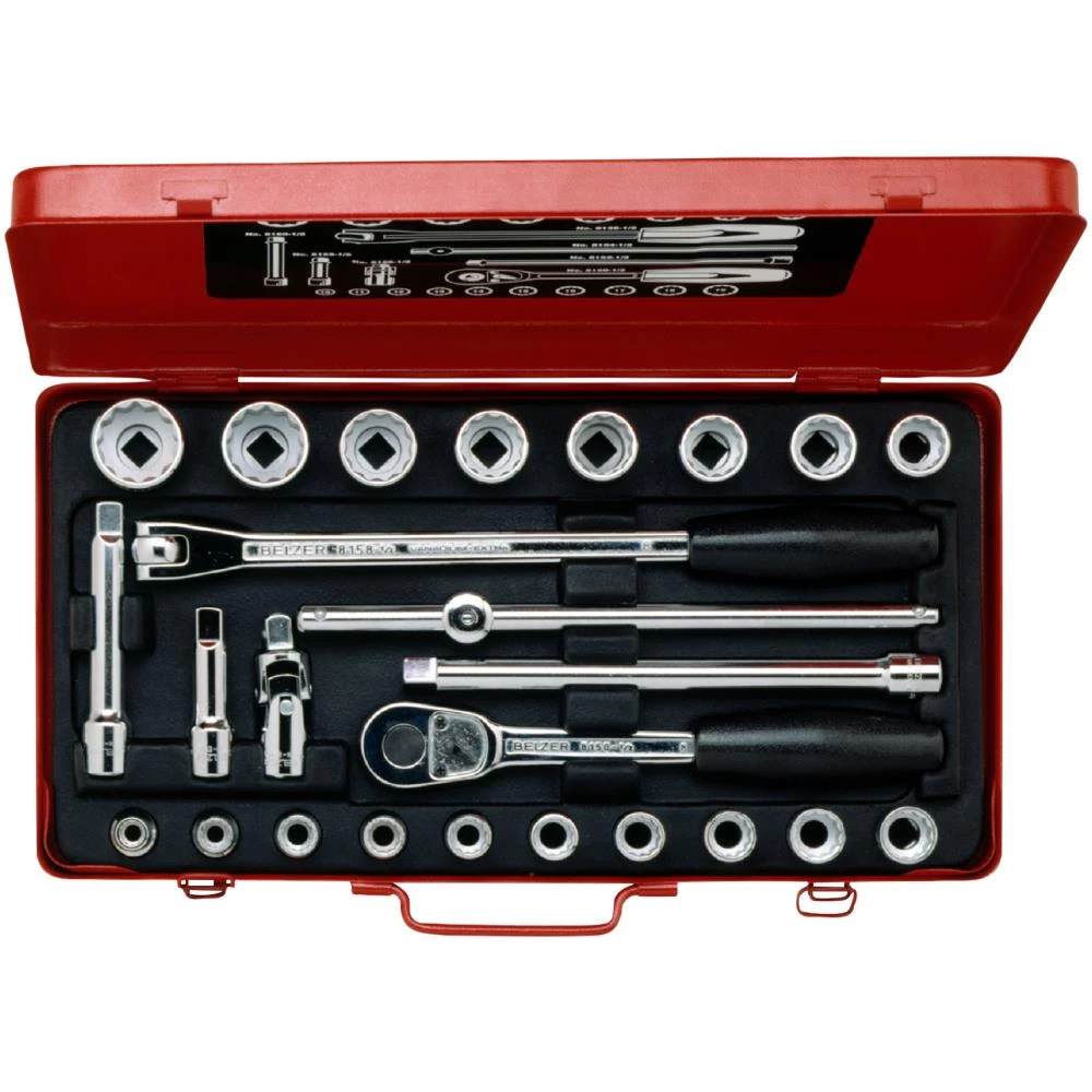 1/2″ topnøglesæt. 12kt-toppe, metrisk. Højtlegeret stål. Højglanspoleret. Ovnlakeret stålkasse. Med kunststofindlæg som fastholder værktøjerne. ISO 1174. DIN 3120.