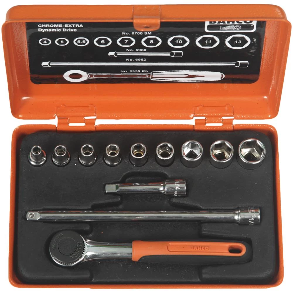 1/4″ topnøglesæt. Højtlegeret stål. Højglanspoleret. Ovnlakeret stålkasse. Med kunststofindlæg som fastholder værktøjerne. ISO 1174. DIN 3120.
