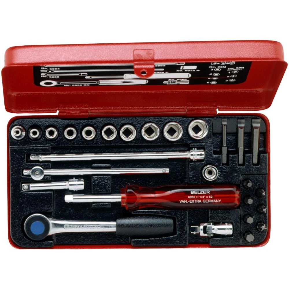 1/4″ topnøglesæt. Højtlegeret stål. Højglanspoleret. Ovnlakeret stålkasse. Med kunststofindlæg som fastholder værktøjerne. ISO 1174. DIN 3120.
