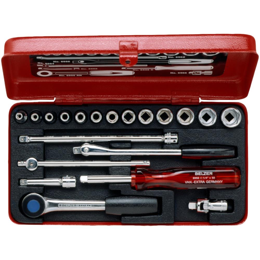 1/4″ topnøglesæt. Højtlegeret stål. Højglanspoleret. Ovnlakeret stålkasse. Med kunststofindlæg som fastholder værktøjerne. ISO 1174. DIN 3120.