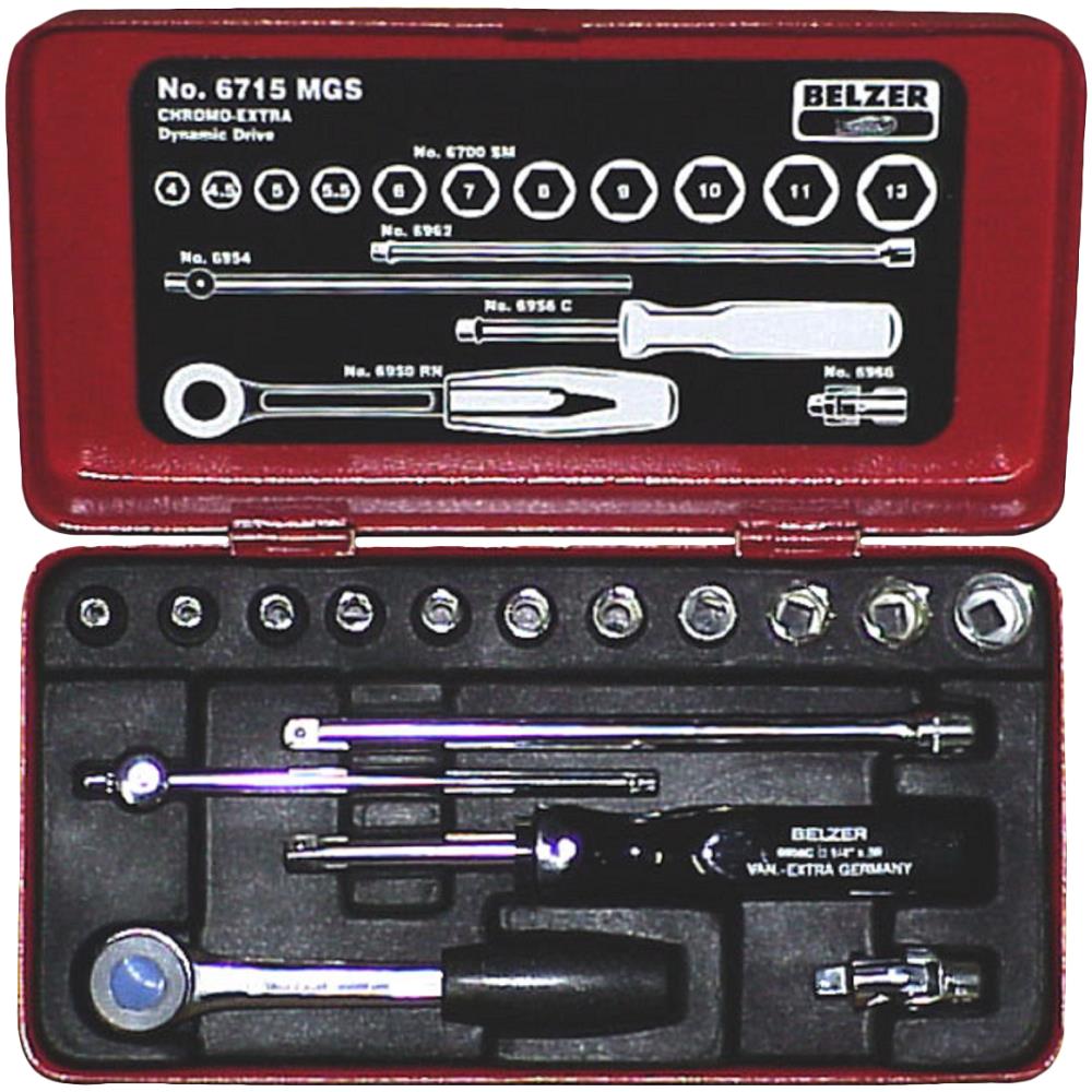 1/4″ topnøglesæt. Højtlegeret stål. Højglanspoleret. Ovnlakeret stålkasse. Med kunststofindlæg som fastholder værktøjerne. ISO 1174. DIN 3120.
