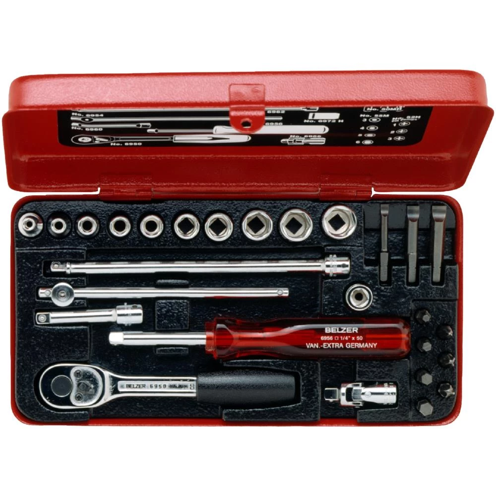 1/4″ topnøglesæt. Højtlegeret stål. Højglanspoleret. Ovnlakeret stålkasse. Med kunststofindlæg som fastholder værktøjerne. ISO 1174. DIN 3120.