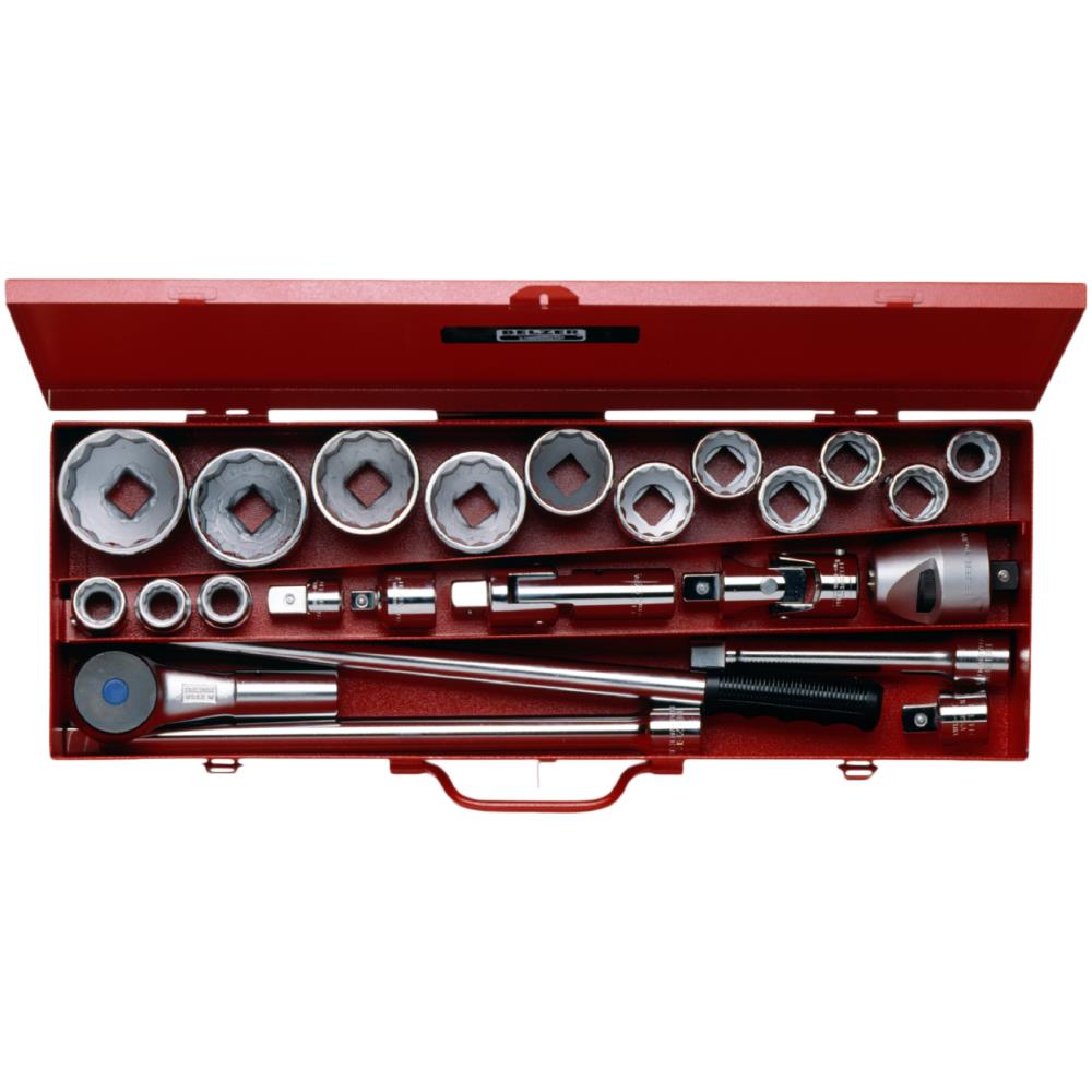 3/4″ topnøglesæt. 12kt-toppe, metrisk. Højtlegeret stål. Højglanspoleret. Stålkasse med stålindlæg. ISO 1174. DIN 3120.