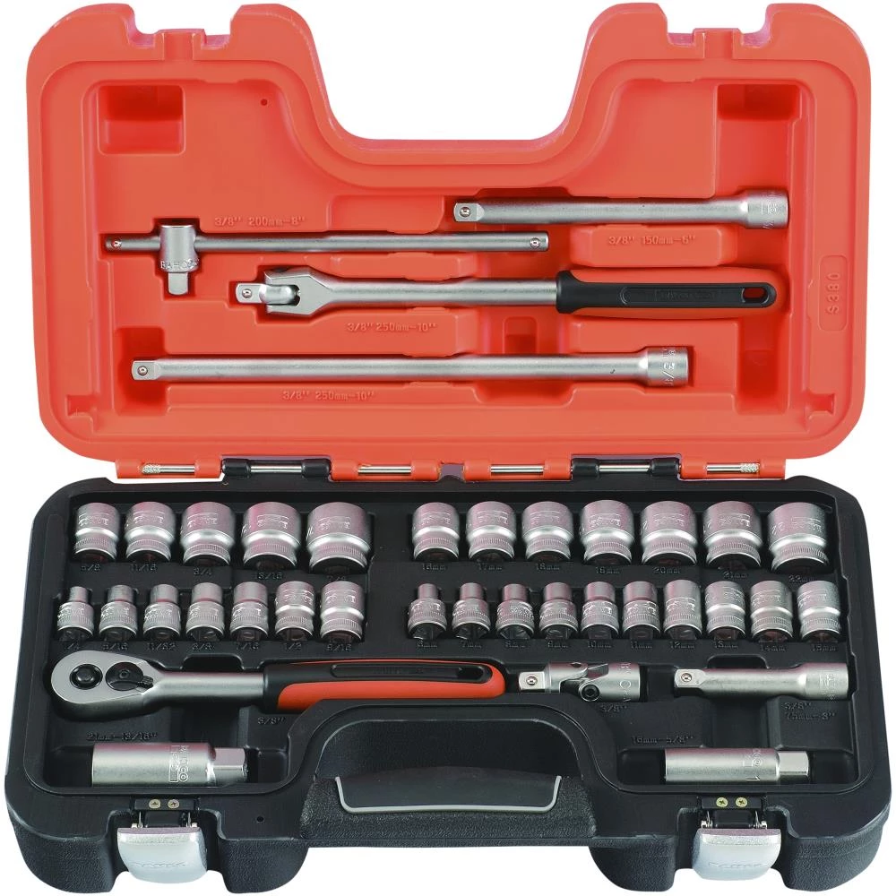 3/8″ topnøglesæt. Højtlegeret stål. Matforkromet. ISO 1174. DIN 3120. Kuffert i slagfast, olie- og temperaturbestandig plast. Indeholder 38 dele. 12 stk. 3/8″ sekskanttoppe: 1/4″, 5/16″, 11/32″, 3/8″, 7/16″, 1/2″, 9/16″, 5/8″, 11/16″, 3/4″, 13/16″, 7/8″. 17 stk. 3/8″ 6kt-toppe: 6, 7, 8, 9, 10, 11, 12, 13, 14, 15, 16, 17, 18, 19, 20, 21, 22 mm. 2 stk. 3/8″ tændrørstoppe 16 og 21 mm (13/16″). 1 stk. 3/8″ skraldenøgle med tokomponent håndtag, 60 tænder og 6° arbejdsvinkel. 3 stk. 3/8″ forlængere 75, 150 og 250 mm. 1 stk. 3/8″ kardanled. 1 stk. 3/8″ t-nøgle. 1 stk. 3/8″ ledhåndtag 250 mm med tokomponent håndtag.