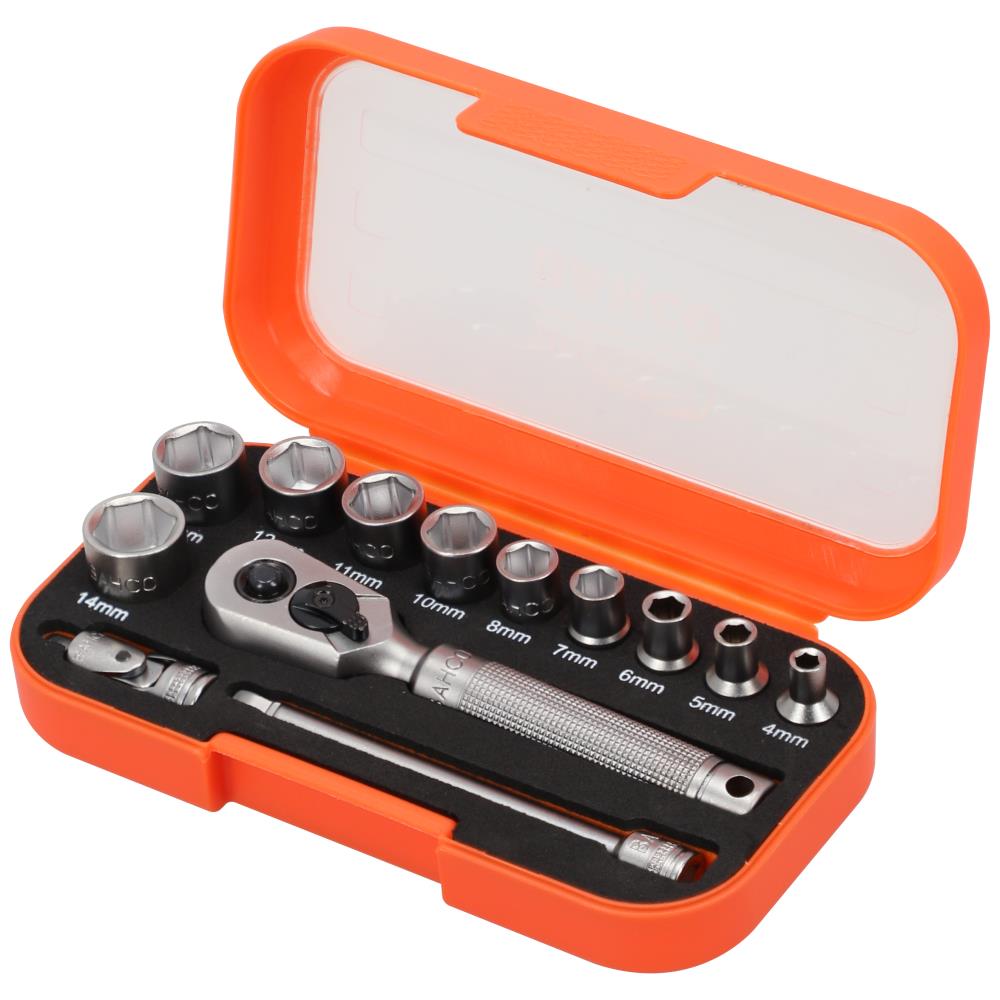Topnøglesæt 1/4″ med 13 dele. Indeholder 10 toppe 4, 5, 6, 7, 8, 10, 11, 12, 13, 14 mm, 1 skraldenøgle short quick-release, adapter og forlænger 100 mm. Leveres i praktisk kassette.