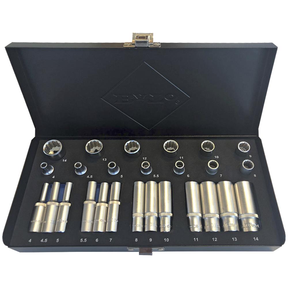 Topsæt med 26 dele. 1/4″ 12kt korte toppe 4,0 – 4,5 – 5,0 – 5,5 – 6,0 – 7,0 – 8,0 – 9,0 – 10,0 – 11,0 – 12,0 – 13,0 – 14,0 mm og lange toppe 4,0 – 4,5 – 5,5 – 6,0 – 7,0 – 8,0 – 9,0 – 10,0 – 11,0 – 12,0 – 13,0 – 14,0 mm. Leveres i metalboks.