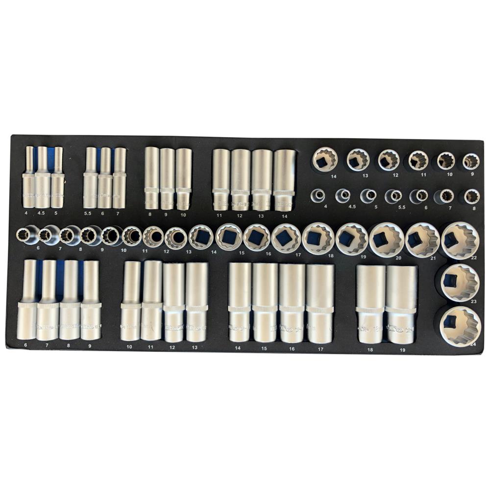 Topsæt i størrelserne 1/4″+3/8″ 12kt korte/lange 4-24 mm. EVA 1/3. Sættet indeholder 1/4″ korte toppe i størrelserne 4 / 4,5 / 5 / 5,5 / 6 / 7 / 8 / 9 / 10 / 11 / 12 / 13 / 14 mm. 1/4″ lange toppe i størrelserne 4 / 4,5 / 5,5 / 6 / 7 / 8 / 9 / 10 / 11 / 12 / 13 / 14 mm. I 3/8″ korte toppe indeholder sættet størrelsene 6 / 7 / 8 / 9 / 10 / 11 / 12 / 13 / 14 / 15 / 16 / 17 / 18 / 19 / 20 / 21 / 22 / 23 / 24 mm. Af lange toppe i 3/8″ findes størrelserne 6 / 7 / 8 / 9 / 10 / 11 / 12 / 13 / 14 / 15 / 16 / 17 / 18 / 19 mm.