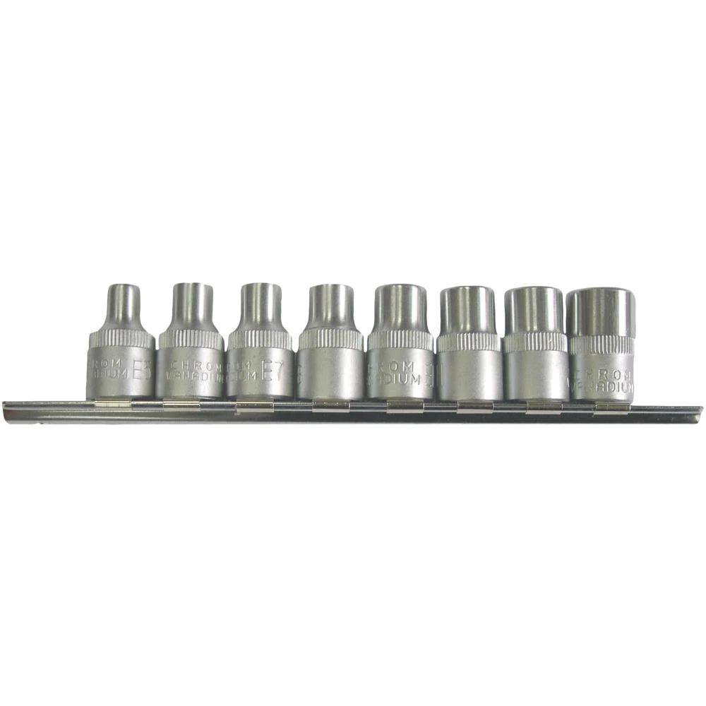 Topsæt med 8 dele. 3/8″ E-toppe: E5-6-7-8-10-11-12-14. Leveres på metalskinne.