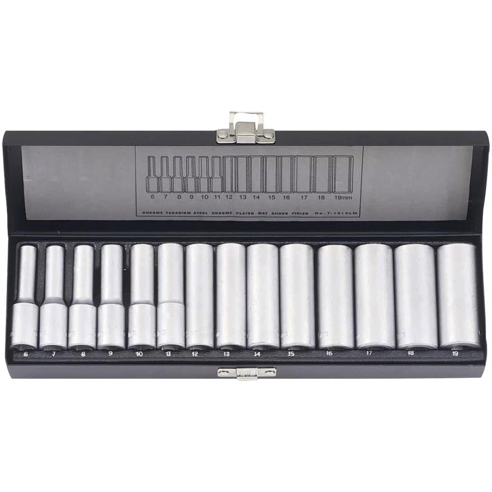 Topsæt med 12 dele. Sættet indeholder lange 3/8″ 6kt toppe 6, 7, 8, 9, 10, 11, 12, 13, 14, 15, 16, 17, 18 og 19 mm. Leveres i metalboks.