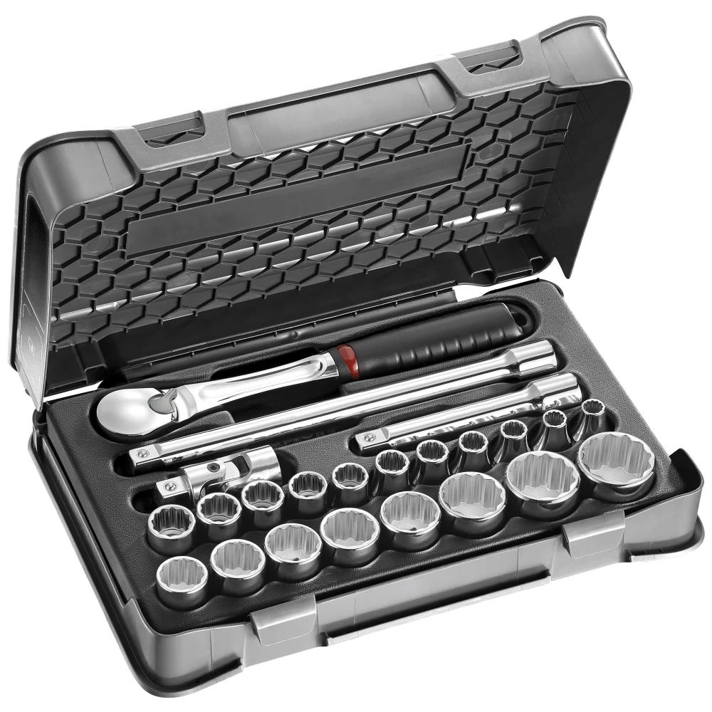 1/2″ topnøglesæt med 23 dele. Sættet indeholder: Toppe 8-9-10-11-12-13-14-15-16-17-18-19-21-22-23-24-27-30-32 mm, forlængere (125 mm, 250 mm), kardanled samt en skraldenøgle. Leveres i praktisk boks.