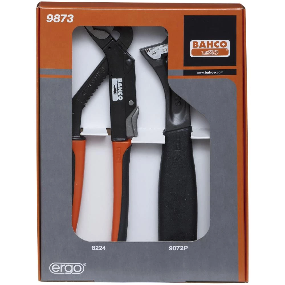 Værktøjssæt udviklet i henhold til Bahcos ERGO program. Rørskiftenøgle 9072P med vendbar kæbe. Vandpumpetang 8224 med to-komponent håndtag og hurtig udløserknap.