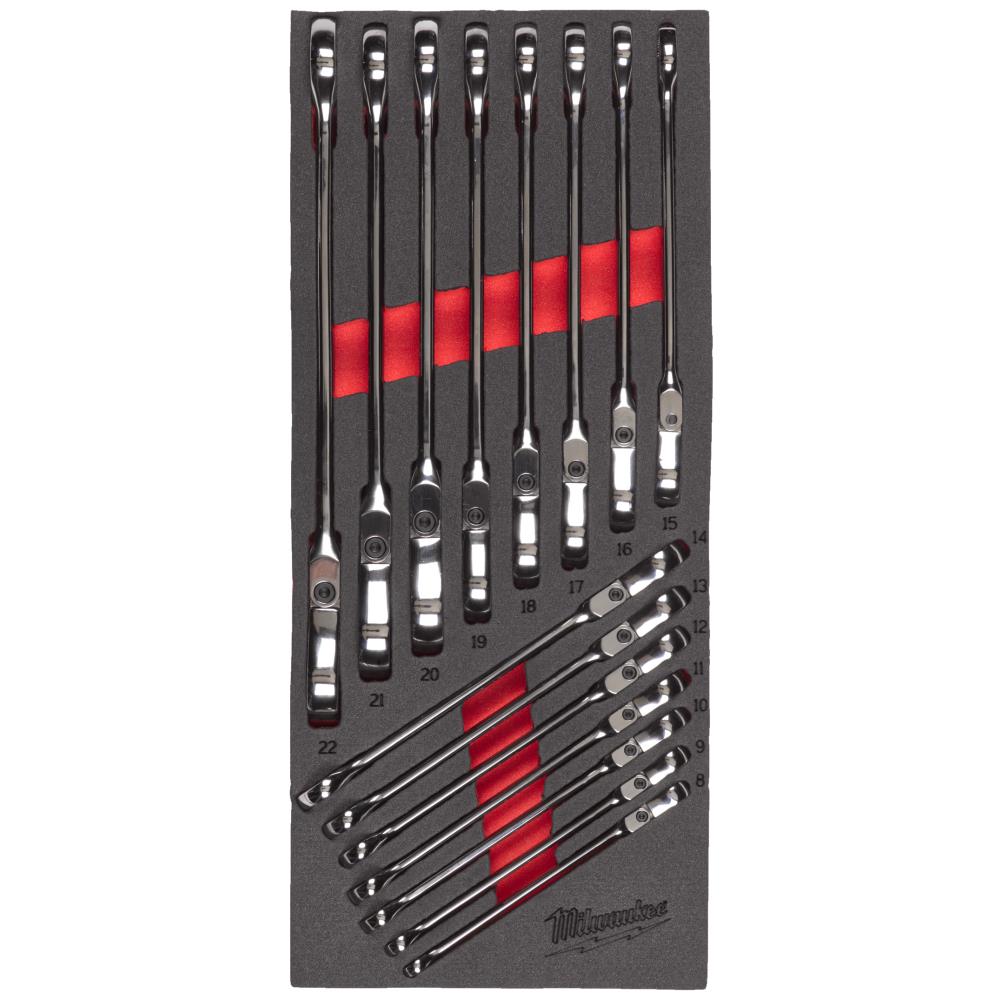 Max-Bite ring-skraldenøglesæt med flex-hoved i skumindlæg. 180° drejbart hoved for bedre adgang på trang plads. 44 skraldetænder giver 2,5° vinklet hoved for let adgang på trang plads. Ekstra holdbar skraldemekanisme for længere levetid. Max-bite greb reducerer afgratning og slitage på bolte. Afrundet I-Beam håndtag for komfortabelt greb. Indeholder: 8, 9, 10, 11, 12, 13, 14, 15, 16, 17, 18, 19, 20, 21, 22 mm.