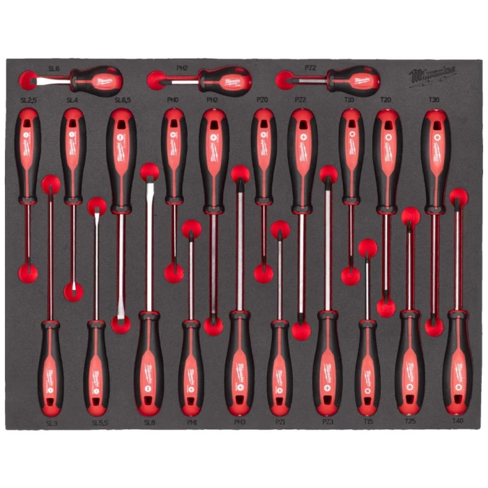 Trilobe skruetrækkersæt i skumindlæg. Komfortabelt Tri-lobe håndtag optimeret til maksimal brugerkomfort og opgaver med højt moment. Hærdet magnetisk spids for maksimal holdbarhed. Skiftenøgle-venligt skaft for endnu mere kraft. Anti-rul, tresidet kant på håndtaget. Indeholder: lige kærv 2,5 / 3 / 4 / 5,5 / 6 / 6,5 / 8 mm, PH0 / PH1 / PH2 / PH2 / PH3, PZ0 / PZ1 / PZ2 / PZ2 / PZ3, samt T10 / T15 / T20 / T25 / T30 / T40.