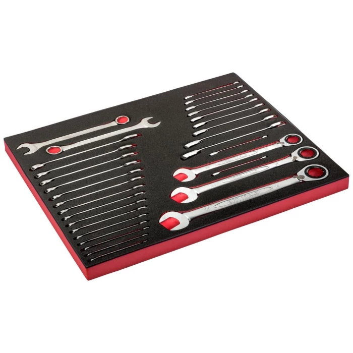 Fit&Go 3/3 skumindlæg med nøglesæt – i alt 31 dele. Fastnøgler og skiftenøgler. Skumindlæg fås med lasermarkering. Skumindlægget er modstandsdygtig over for Skydrol, benzin, vand og UV-stråler. Tryksystem, så værktøjsudtagning gøres lettere. Skumindlægsystemet giver mulighed for en pæn og ordentlig organisering af værktøj.
