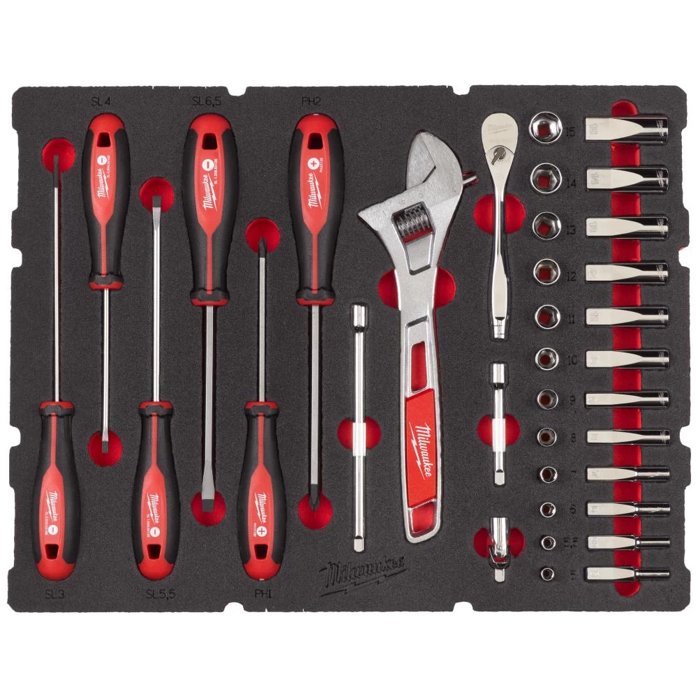Packout skumindsats med 1/4″ topnøglesæt til Packout skuffebokse. Skumindlægget passer til Packout skuffeboks med tre skuffer (4932472130) og i en skuffeboks med to skuffer (4932472129). Indeholder: 1/4″ skraldenøglesæt med 28 dele korte toppe kort: 5 mm, 5,5 mm, 6 mm, 7 mm, 8 mm, 9 mm, 10 mm, 11 mm, 12 mm, 13 mm, 14 mm, 15 mm og lange toppe: 5 mm, 5,5 mm, 6 mm, 7 mm, 8 mm, 9 mm, 10 mm, 11 mm, 12 mm, 13 mm, 14 mm, 15 mm, Trilobe skruetrækkere 6 dele SL3 /SL 4 / SL5 / SL 6 / PH 1 / PH 2 og 250 mm skiftenøgle.