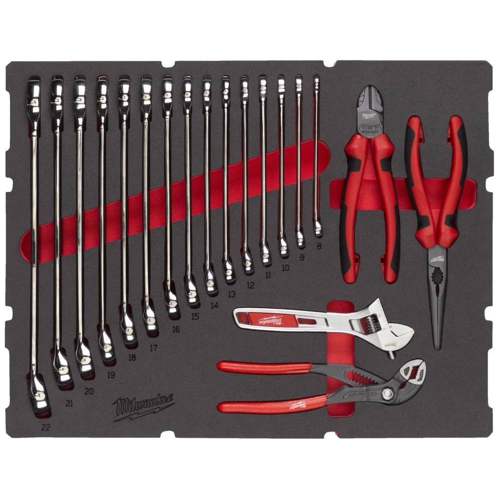 Packout skumindsats med fastnøgler og tænger til Packout skuffebokse. Skumindlægget passer til Packout skuffeboks med tre skuffer (4932472130) og i en skuffeboks med to skuffer (4932472129). Indeholder Maxbite metrisk fastnøglesæt med 15 dele: 8, 9, 10, 11, 12, 13, 14, 15, 16, 17, 18, 19, 20, 21, 22 mm, skævbider med lang næse, skævbider, vandpumpetang og skiftenøgle.