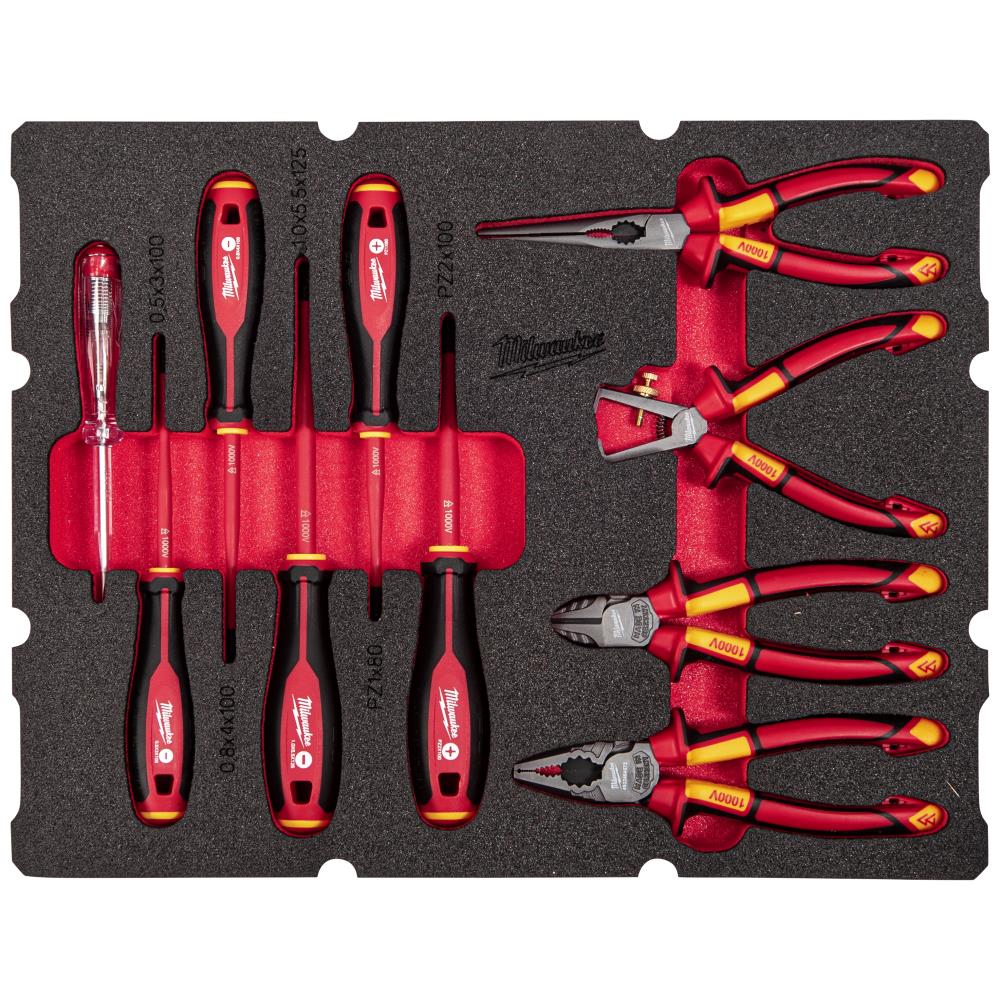 Packout skumindsats med elektrikerværktøj til Packout skuffebokse. Testet til 10.000 V og garanteret til 1.000 V. Optimal kraft for et nemt og ubesværet arbejde. Kræver op til 60 % mindre kraft ved skæring. Slim isoleret belægning til elektriker applikationer i trange rum. Tri-lobe håndtag for maksimalt drejningsmoment. Firkantet håndtag. Premium skum for længere holdbarhed, laserskårede størrelser for nem og hurtig størrelses identifikation og rød baggrund. Indeholder: VDE afisoleringstang 160 mm (4932464573), VDE spidstang (4932464564), VDE skævbider 160 mm (4932464567), VDE kombinationstang 180 mm (4932464572), TRI-LOBE VDE SL skruetrækker 0,5×3×100 (4932478713), Volt-tester (4932478719), TRI-LOBE VDE skruetrækker PZ 1×80 mm (4932478725), PZ 2×100 mm (4932478726),TRI-LOBE VDE skruetrækker SL 0,8×4×100 (4932478715) og 1,0×5,5×125 (4932478716).