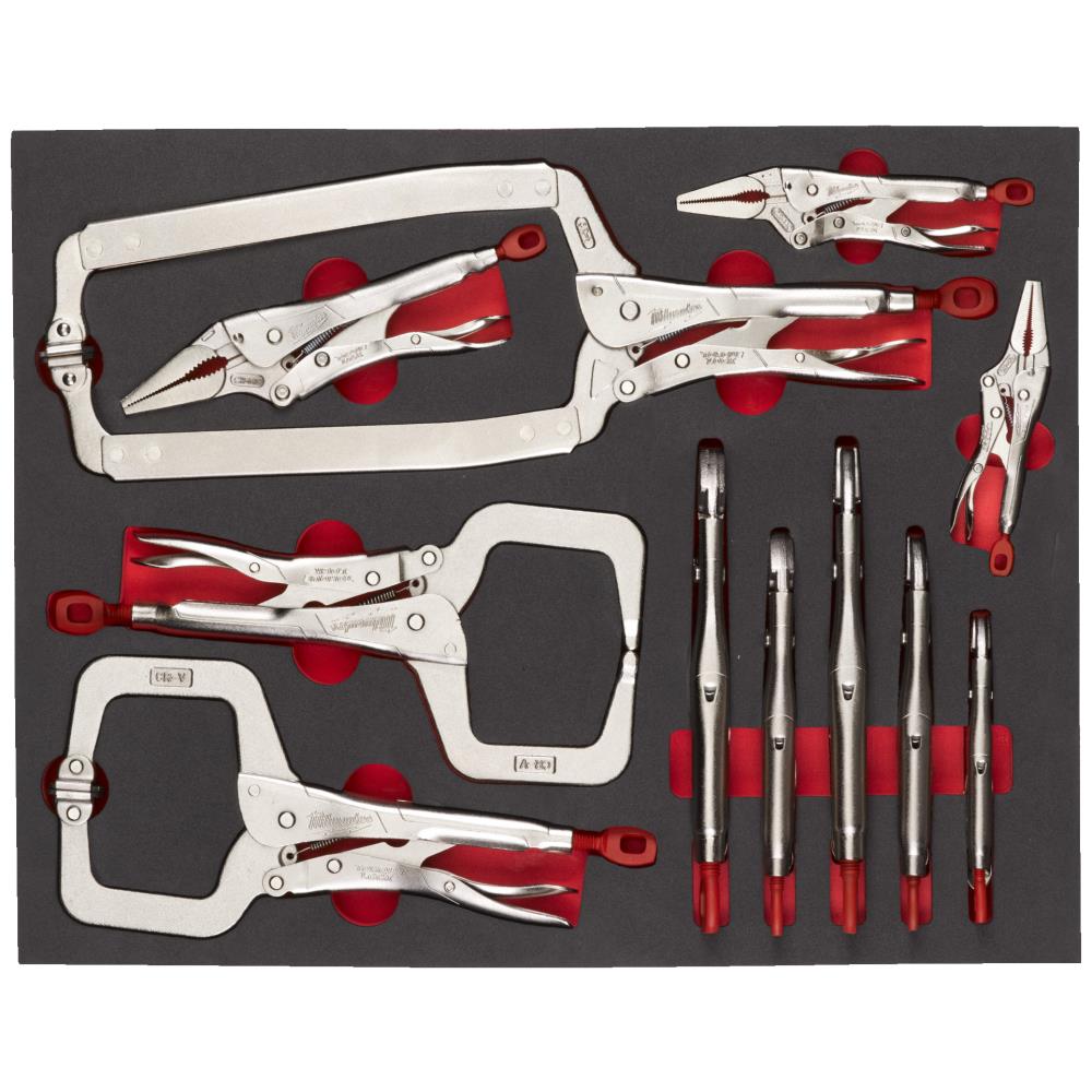 Skumindsats med Torque Lock svejsetangsæt 11 dele. Torque Lock til hurtig fastspænding og frigørelse. Krog til manuel justering af gribekraften – krogen kan også bruges til ophæng af værktøjet. Hærdede, aggressive kæber for maksimalt greb. Krombelagt for ekstra rustbeskyttelse. Fjedersystem åbner automatisk kæberne for optimal komfort. Maxbite tængerne har specialkæber der giver maksimalt greb om materialet. Indhold: Torque Lock svejsetang med buet kæbe 127 mm, Torque Lock svejsetang med buet kæbe 170 mm, Torque Lock svejsetang med buet kæbe 250 mm, Torque Lock svejsetang med fast tryksko 280 mm, Torque Lock svejsetang med lang næse 100 mm, Torque Lock svejsetang med lang næse 150 mm, Torque Lock svejsetang med lang næse 230 mm, Torque Lock svejsetang Maxbite 170 mm, Torque Lock svejsetang Maxbite 250 mm, Torque Lock svejsetang med bevægelige tryksko 280 mm, samt Torque Lock svejsetang med bevægelige tryksko 480 mm. Leveres med skumindlæg til sortimentet af værktøjsvogne.