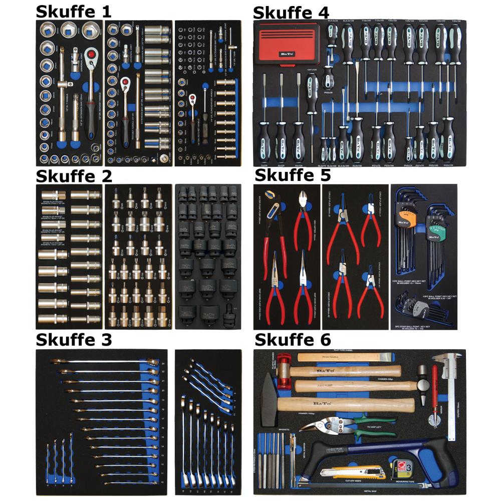 Værktøjsvogn med syv skuffer med 394 værktøjsdele. Bl.a. topnøglesæt 1/2″ – 3/8″ – 1/4″, lange toppe, stifttoppe, krafttoppe 10-38 mm, ringgaffel- og ringskraldenøgler, tænger, skruetrækkere, stiftnøgler og hamre.