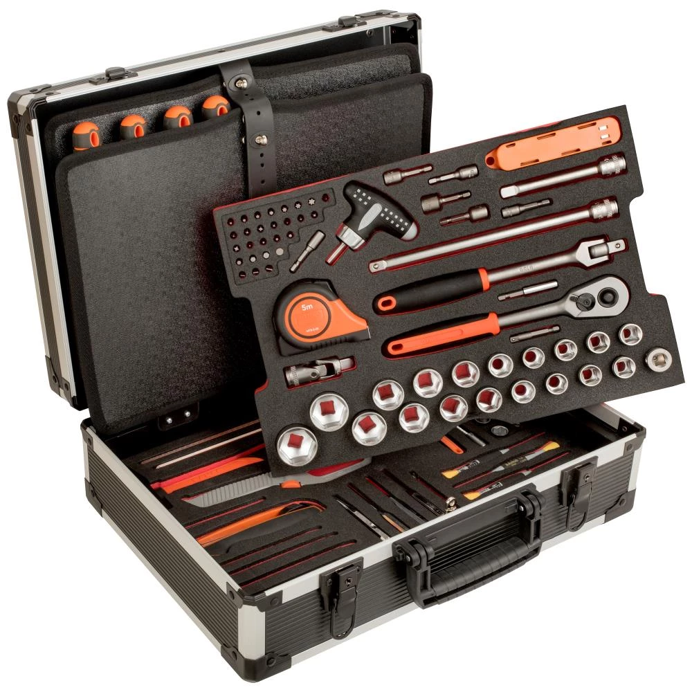 Heavy-duty aluminiums-værktøjskuffert med 145 dele. Kufferten har sprøjtestøbte ABS-vægge med stærk ramme, to metallåse med nøgler, ergonomisk soft grip håndtag, dokument-tegnebog med værktøjsopbevaringsrum og to specielle sikkerhedshængsler. Indeholder stort udvalg af værktøj: kombinationsnøgler, skruetrækkere, 1/4″ og 1/2″ toppe hex, slående og skærende værktøj, tænger og bits. Der medfølger to værktøjspaller med elastikker.