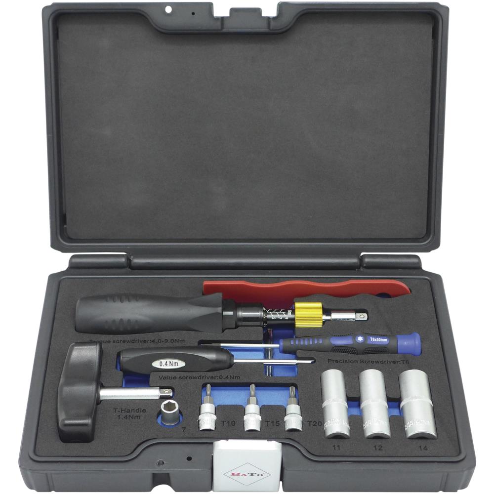 Tire Pressure Monitoring System (TPMS) moment-værktøjssæt med 14 dele. Sættet indeholder: 1/4″ momentskruetrækker (4-9 Nm), 1/4″ moment T-greb (1,4 Nm fast), momentventil-skruetrækker (0,4 Nm fast), skruetrækker Torx TX6, 1/4″ lange toppe 11-12-13 mm, 1/4″ korte toppe 7 mm, 1/4″ stifttoppe Torx TX10-15-20, plast afmonteringsjern samt 3 stk. fikserpinde. Visningsafvigelse i procent ± 4 %. Leveres i praktisk kuffert.