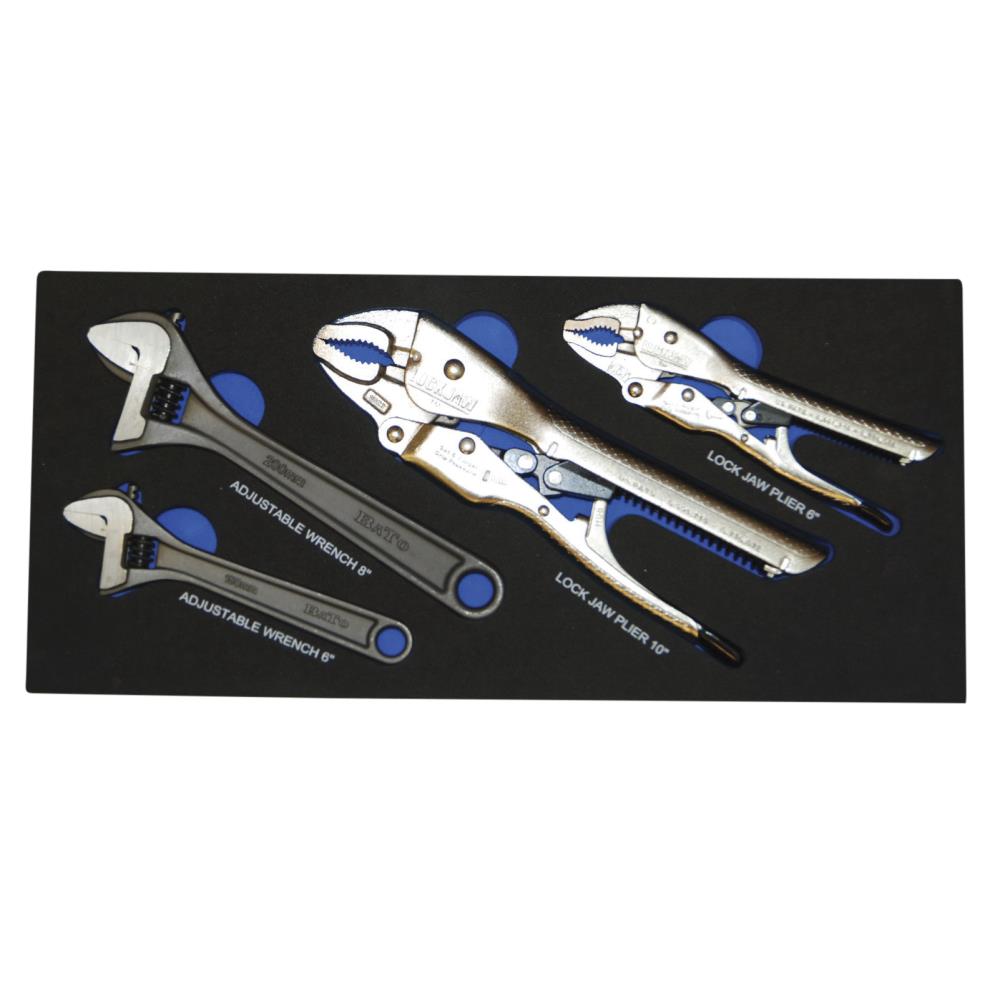 Værktøjssæt med 4 dele i EVA-skumindlæg klar til værktøjsvognsskuffe. Sættet indeholder: 6″ og 8″ skiftenøgle samt 5″ og 10″ GripOn svejsetang. Skumindlægget fylder 1/3 skuffe i Bato værktøjsvogn.