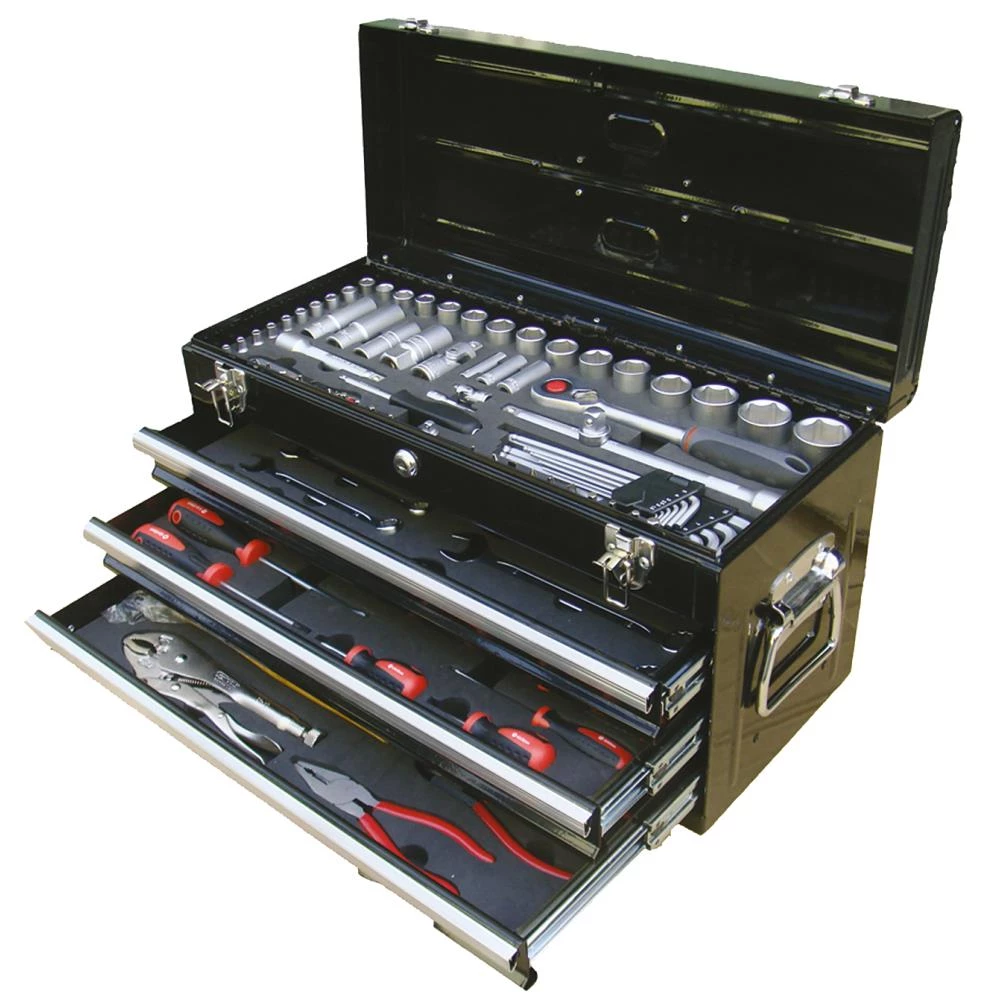 Værktøjssæt med 99 værktøjsdele i kuffert med 3 skuffer. Indeholder: korte 1/2″ toppe (4-5-6-7-8-9-10-11-12-13-14 mm), lange 1/4″ toppe (8-10-13 mm), 1/4″ bitstoppe lige kærv (4,0-4,5-7,0 mm), 1/4″ bitstoppe Phillips (PH1-2-3, Pozidriv PZ1-2, 6kt 3-4-5-6-7-8 mm, Torx TX10-15-20-25-27-30-40), 1/4″ forlænger med wobble 50 mm, 1/4″ kardanled, 1/4″ T-greb, 1/4″ skraldenøgle, korte 1/2″ toppe (13-15-17-18-19-20-21-22-24-27-30-32 mm), lange 1/2″ toppe (17-19 mm), 1/2″ tændrørstoppe (16-21 mm). 1/2″ forlænger med wobble 125-250 mm, adapter 3/8″×1/2″ mm, 1/2″ kardanled, 1/2″ skraldenøgle, stiftnøgler m/kugle (1,5 – 2,0 – 2,5 – 3,0 – 4,0 – 5,0 – 6,0 – 7,0 – 8,0 – 10,0 mm), ringgaffelnøgler (8-9-10-11-12-13-14-15-16-17-18-19 mm), skruetrækkere (lige kærv 4,0×100 mm, 5,5×125 mm, 6,5×125 mm, 8,0×150 mm, Phillips PH2×38 mm, PH1×75 mm, PH2×100 mm, PH3×150 mm), bidetang, spidstang, kombinationstang, vandpumpetang og svejsetang, hammer.