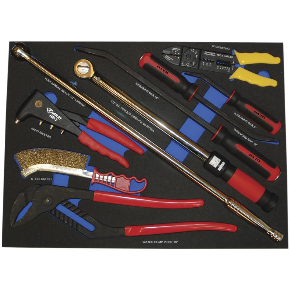 Værktøjs-kombisæt med 9 dele i EVA-skumindlæg klar til værktøjsvognsskuffe. Sættet indeholder: 1/2″ momentnøgle 20-200 Nm, håndnittetang 2,4-5,0 mm, vandpumpetang, 1/2″ ledgreb, smal stålbørste, kabelskotang og brækjern hhv. 8″, 12″ og 18″. Skumindlægget fylder 1/1 skuffe i Bato værktøjsvogn.