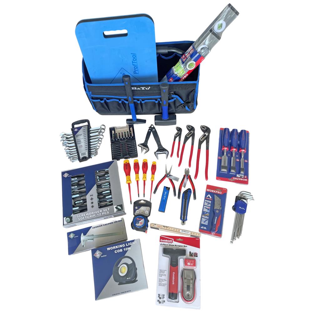 Gør-det-selv Prof Luksus værktøjssæt med 92 værktøjsdele til gør-det-selv håndværkeren. Sættet indeholder: Stor værktøjstaske i tekstil med 21 dele bitssæt Torsion 1/4″ 50 mm lang, 2 skiftenøgler med SoftGrip hhv. 6″ og 8″, 12 dele ringgaffelnøglesæt 8-19 mm, 3 dele vandpumpetangsæt hhv. 175 – 250 – 300 mm, 12 dele skruetrækkersæt kærv/Torx/PH/PZ, 4 VDE-skruetrækkere hhv. kærv 3,0 mm/PH1/PZ1/PZ2, sideafbider, lige spidstang, 9 dele stiftnøglesæt 1,5-10,0 mm, 300 g bænkhammer, 1.500 g mukkert, 5 mtr. båndmål med magnet og bælteclips, 18 mm hobbykniv med super auto-lock, pk m/10 stk. 18 mm black bræk-af-knivblade ultra skarp, 2 mtr. tommestok i træ, skydelære, Goldblatt glasskrabersæt, Workpro foldekniv, Workpro stemmejernsæt 12-19-25 mm, 3 dele Workpro vaterpassæt 3 dele hhv. 225/300/600 mm, arbejdslampe COB 10W med flex magnetfod, samt EVA-knæpude.