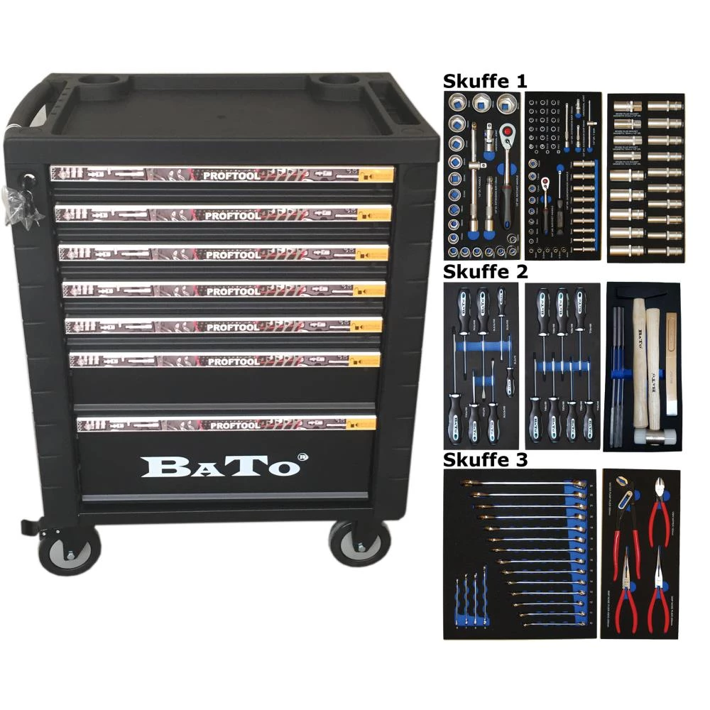 Værktøjsvogn med hjul og syv skuffer – heraf tre skuffer med i alt 132 værktøjsdele i EVA-skumindlæg. 1/2″ topnøglesæt: 6kt toppe kort 10 – 11 – 12 – 13 – 14 – 15 – 16 – 17 – 18 – 19 – 21 – 22 – 24 – 27 – 30 – 32 – 34 – 36 mm, forlænger 1/2″×125 mm – 1/2″×250 mm, T-grebs adapter, 1/2″ kardanled og 1/2″ skraldenøgle. 1/4″ topnøglesæt: 6kt toppe kort 4 – 4,5 – 5 – 5,5 – 6 – 7 – 8 – 9 – 10 – 11 – 12 – 13 – 14 mm, toppe lang 6 – 7 – 8 – 9 – 10 – 11 – 12 – 13 – 14 mm, stifttoppe 6kt 3 – 4 – 5 – 6 – 7 – 8 mm, Torx 10 – 15 – 20 – 25 – 30 – 40, PZ1 – PZ2, PH1 – PH2, kærv 5,5 mm, forlænger 1/4″×50 mm – 1/4″×100 mm, T-grebsglider, 1/4″ kardanled, 1/4″ tophåndtag og 1/4″ skraldenøgle. 1/2″ topsæt: 6kt toppe lang 10 – 11 – 12 – 13 – 14 – 15 – 16 – 17 – 18 – 19 – 20 – 21 – 22 – 23 – 24 mm, tændrørstoppe 1/2″ 16 – 18 – 21 mm og 3/8″ 14 mm. Ringgaffelnøglesæt: 6 – 7 – 8 – 9 – 10 – 11 – 12 – 13 – 14 – 15 – 16 – 17 – 18 – 19 – 20 – 21 – 22 – 24 mm. Tangsæt: sideafbider 160 mm, spidstang lige 200 mm, spidstang buet 200 mm, vandpumpetang 250 mm. Skruetrækkersæt: kærv 3,0×75 mm, 4,0×100 mm, 5,5×100 mm, 6,5×150 mm, Phillips PH1×75 mm, PH2×100 mm og PH3×150 mm. Skruetrækkersæt Torx: TX10×100 mm, TX15×100 mm, TX20×100 mm, TX25×100 mm, TX27×100 mm, TX30×100 mm og TX40×100 mm. Hammersæt: bænkhammer 500 g, nylonhammer ø35 mm, dornsæt 3 – 4 – 5 – 6 – 8 – 10 mm, fladmejsel 230×25 mm.