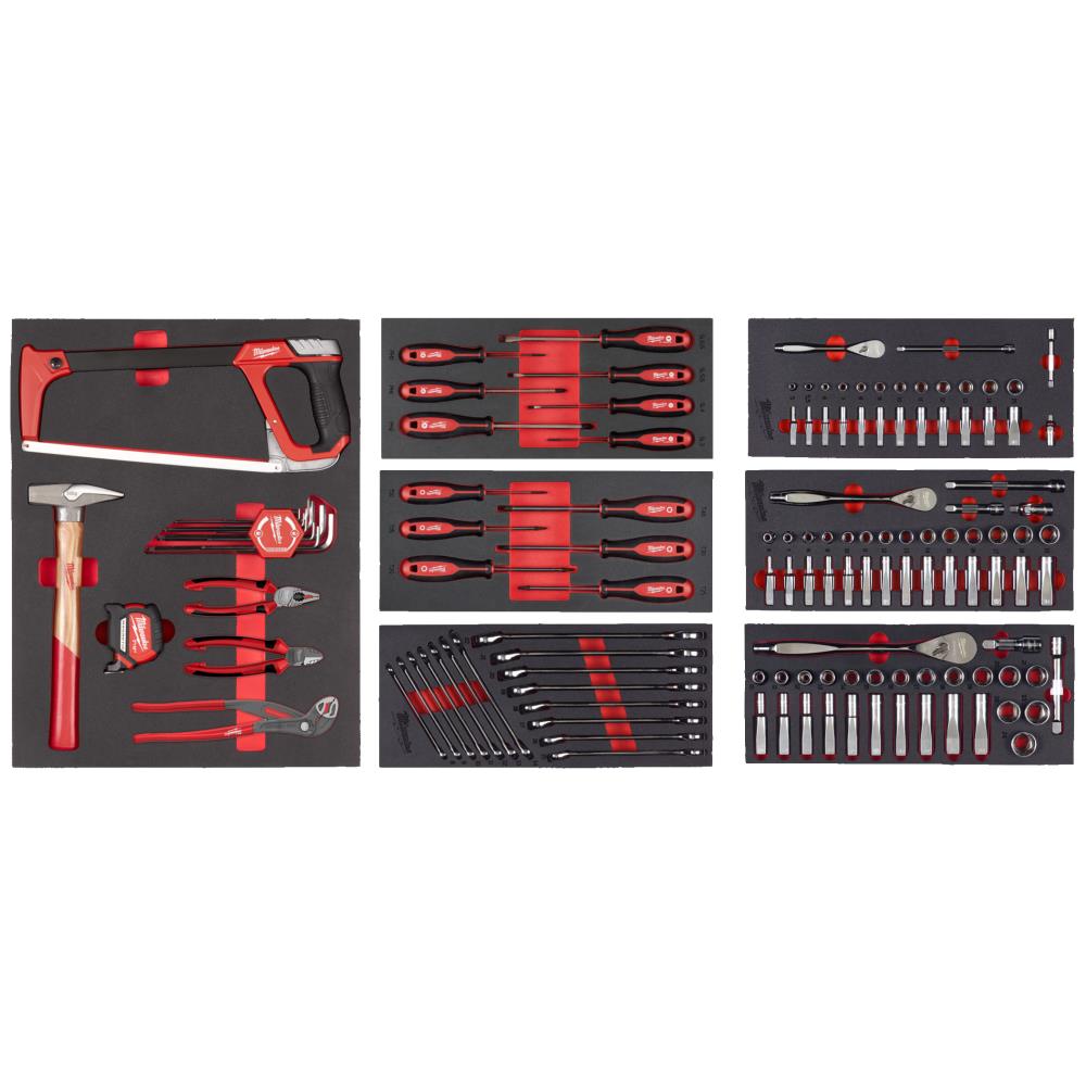 Toolguard værktøjsvogn med 3 ud af 7 skuffer fyldt med essentielle værktøjer, pænt organiseret i skumindsatser for optimal orden. Skuffer med en belastningskapacitet på 35 kg og bundskuffe med en kapacitet på 70 kg. Væltesikring sikrer, at kun én skuffe kan åbnes ad gangen. 125 mm industrielle hjul (2× faste, 2× drejelige, 1× bremse). Vognen er udrustet med: skraldenøgler med 90-tands design og 4° buesving til arbejde i trange rum. Ringgaffelnøglesæt med MaxBite åbent greb, der reducerer afrunding og beskadigelse af bolthoveder. Skruetrækkere med komfortabelt Tri-Lobe-håndtag, optimeret til maksimal brugerkomfort og høj momentanvendelse. Skumindsats med 1/4″ skralde- og toppesæt – 28 dele (4932479824), skumindsats med 3/8″ skralde- og toppesæt – 23 dele (4932479825), skumindsats med 1/2″ skralde- og toppesæt – 28 dele (4932479826), skumindsats med MaxBite fastnøglesæt (4932479827), skumindsats med Tri-Lobe TX skruetrækkersæt – 6 dele (4932492392), skumindsats med Tri-Lobe SL & PH skruetrækkersæt – 7 dele (4932492394), skumindsats med værktøjssæt – 15 dele (4932493257).