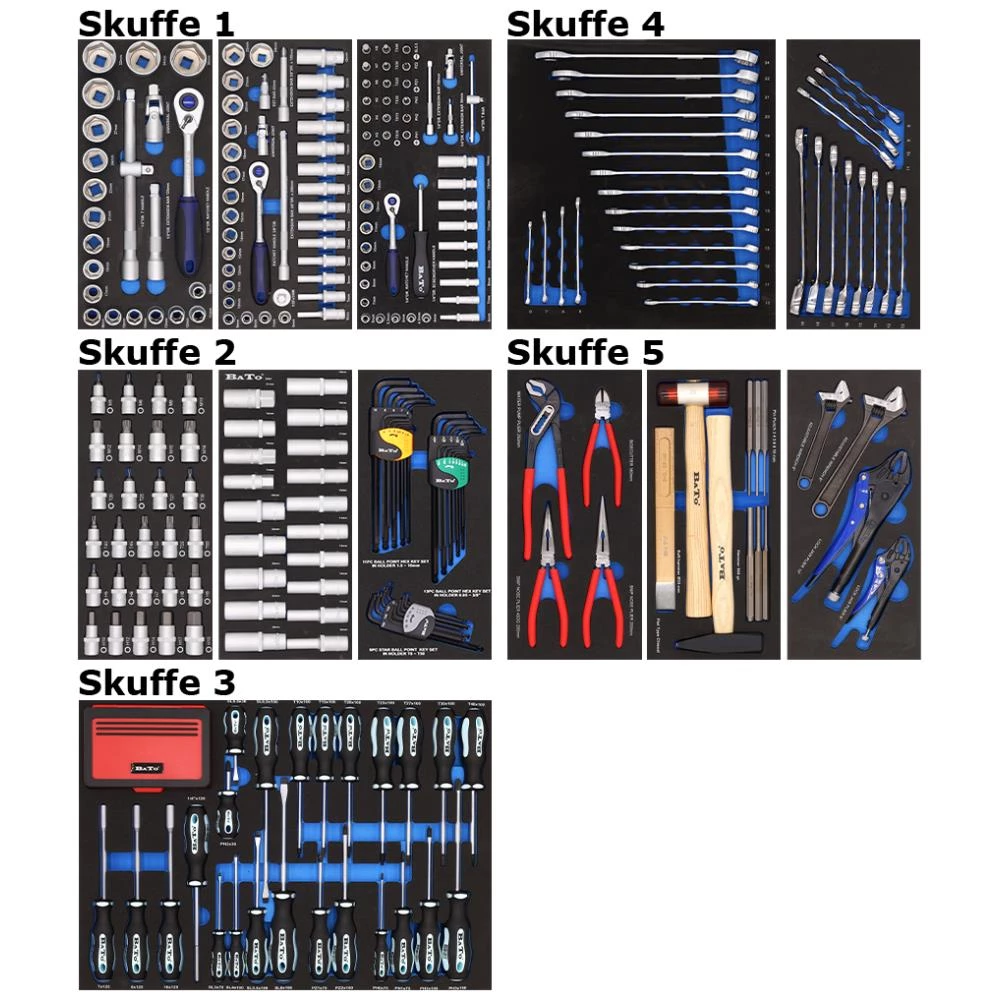 Værktøjsvogn med 356 værktøjsdele. Vognen har 7 skuffer, heraf 5 skuffer med værktøj placeret i formstøbt EVA-skum. Værktøjsindhold: 1/2″ topnøglesæt 10-36 mm, 3/8″ topnøglesæt 6-24 mm, 1/4″ topnøglesæt 4-14 mm, 1/2″ stifttoppesæt 6kt/Torx/XZN, 1/2″ langtoppesæt 10-24 mm, stiftnøglesæt, mega skruetrækkersæt med bits, ringgaffelnøglesæt 6-24 mm, ringskraldenøglesæt 8-19 mm, tangsæt, hammersæt, og skiftenøgle/svejseholdetang.