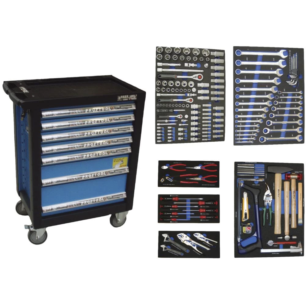 Værktøjsvogn med hjul og syv skuffer – heraf fire skuffer med i alt 174 værktøjsdele i EVA-skumindlæg. 1/4″ toppe: 5/32 – 3/16 – 7/32 – 1/4 – 9/32 – 5/16 – 11/32 – 3/8 – 7/16 – 1/2. 1/4″ toppe lange: 5/32 – 3/16 – 7/32 – 1/4 – 9/32 – 5/16 – 11/32 – 3/8 – 7/16 – 1/2. 1/4″ T-greb med glidehoved 3/8″F × 1/4″M. 1/4″ stifttoppe 6 kt: 1/16 – 6/54 – 3/32 – 7/16 – 1/8 – 9/16 – 5/32 – 3/16 – 7/32 – 1/4. 1/4″ skraldenøgle 48t. 3/8″ toppe: 3/8 – 13/32 – 7/16 – 15/32 – 1/2 – 9/16 – 19/32 – 5/8 – 11/16 – 3/4 – 25/32 – 13/16 – 7/8 – 15/16. 3/8″ toppe lange: 3/8 – 7/16 – 1/2 – 9/16 – 5/8 – 3/4 – 11/16. 3/8″ tændrørstoppe: 5/8 – 3/4 – 13/16. 3/8″ kardanled. 3/8″ forlænger med woble 150 mm (double funktion). 3/8″ T-greb med glidehoved 1/2″F × 3/8″M. 3/8″ skraldenøgle 48t. 1/2″ toppe: 1/2 – 9/16 – 19/32 – 5/8 – 11/16 – 3/4 – 13/16 – 7/8 – 15/16 – 1 – 1.1/16 – 1.1/8 – 1.3/16 – 1.1/4″. 1/2″ toppe lange: 3/4 – 13/16 – 7/8 – 15/16 – 1/2 – 9/16 – 5/8 – 11/16. 1/2″ kardanled. Forlængere med woble 125 + 150 mm (double funktion). 1/2″ T-greb med glidehoved 3/8″F × 1/2″M. 1/2″ stifttoppe 6 kt: 5/16 – 3/8 – 7/16 – 1/2 – 9/16 – 5/8 – 3/4. 1/2″ skraldenøgle 48t. Ringgaffelnøgler: 1/4 – 9/32 – 5/16 – 11/32 – 3/8 – 7/16 – 1/2 – 9/16 – 5/8 – 11/16 – 3/4 – 13/16 – 7/8 – 15/16 – 1″. Ringskraldenøgler: 5/16 – 3/8 – 7/16 – 1/2 – 9/16 – 5/8 – 11/16 – 3/4″. Stiftnøglesæt med kugle: 1/16 – 5/64 – 3/32 – 1/8 – 5/32 – 3/16 – 1/4 – 5/16 – 3/8″. Tangsæt: sideafbider 160 mm, spidstang lige 200 mm, spidstang buet 200 mm, vandpumpetang 250 mm. Skruetrækkersæt PH-kærv. Værktøjssæt med skiftenøgler 6″ – 8″ og svejsetænger 5″ – 10″. Kombi-værktøjssæt: penhammer 435 g, smedehammer 1.500 g, plasthammer ø35 mm, nedstryger, hobbykniv 18 mm, båndmål 3 mm, ridsespids, teleskopmagnet, teleskopspejl, splituddriversæt 3-10 mm, pladesaks, skydelære 150 mm, og flad mejsel.