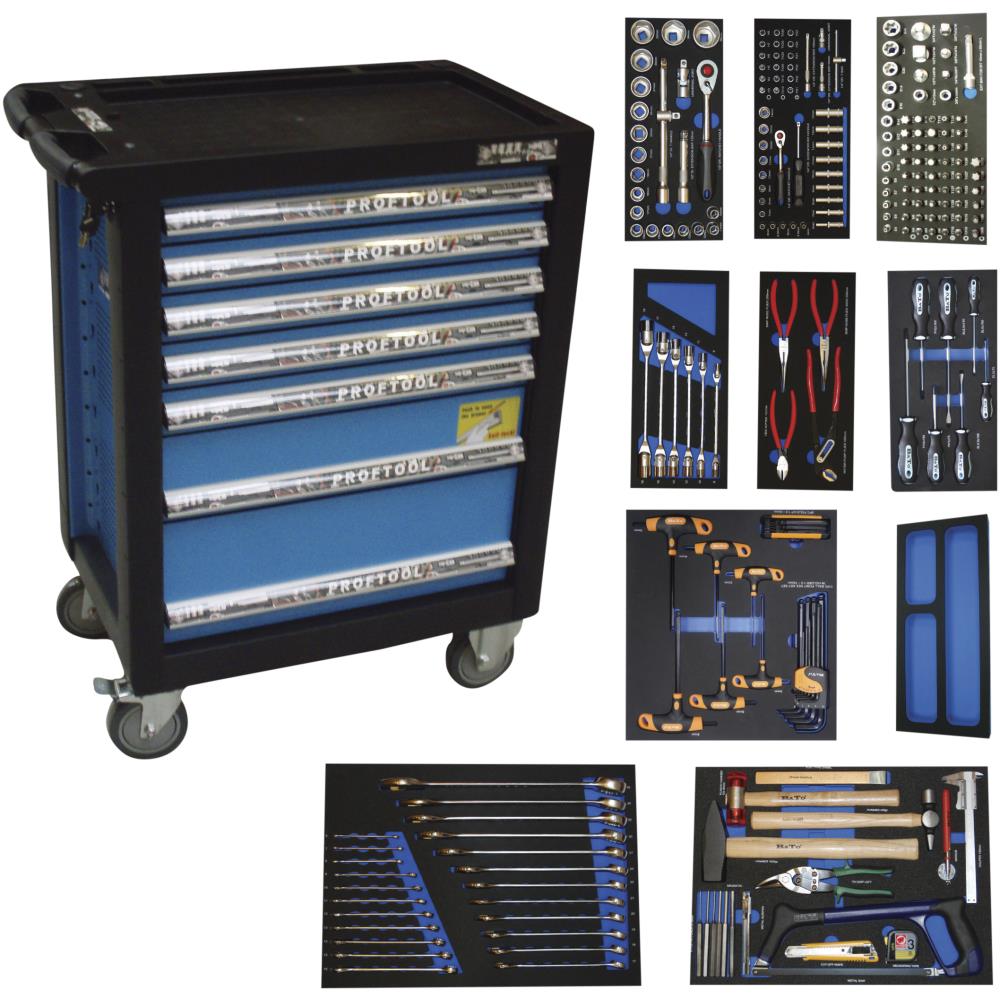 Værktøjsvogn med hjul og syv skuffer – heraf fem skuffer med i alt 231 værktøjsdele i EVA-skumindlæg. 1/2″ topnøglesæt: 6kt toppe kort 10 – 11 – 12 – 13 – 14 – 15 – 16 – 17 – 18 – 19 – 21 – 22 – 24 – 27 – 30 – 32 – 34 – 36 mm, forlænger 1/2″×125 mm – 1/2″×250 mm, T-grebs adapter, 1/2″ kardanled og 1/2″ skraldenøgle. 1/4″ topnøglesæt: 6kt toppe kort 4 – 4,5 – 5 – 5,5 – 6 – 7 – 8 – 9 – 10 – 11 – 12 – 13 – 14 mm, toppe lang 6 – 7 – 8 – 9 – 10 – 11 – 12 – 13 – 14 mm, stifttoppe 6kt 3 – 4 – 5 – 6 – 7 – 8 mm, Torx 10 – 15 – 20 – 25 – 30 – 40, PZ1 – PZ2, PH1 – PH2, kærv 5,5 mm, forlænger 1/4″×50 mm – 1/4″×100 mm, T-grebsglider, 1/4″ kardanled, 1/4″ tophåndtag og 1/4″ skraldenøgle. Auto/E-toppe/Adaptersæt. Skruetrækkersæt: kærv 3,0 × 75 mm – 4,0 × 100 mm – 5,5 × 100 mm – 6,5 × 150 mm, PH1 × 75 mm – PH2 × 100 mm – PH3 × 150 mm. Ringgaffelnøglesæt: 6 – 7 – 8 – 9 – 10 – 11 – 12 – 13 – 14 – 15 – 16 – 17 – 18 – 19 – 20 – 21 – 22 – 24 – 27 – 30 – 32 – 34 – 36 mm. Dobbelt lednøglesæt: 8×9 – 10×11 – 12×13 – 14×15 – 16×17 – 18×19 mm. Tangsæt: sideafbider 160 mm, spidstang lige 200 mm, spidstang buet 200 mm, vandpumpetang 250 mm. Stiftnøglesæt: T-greb 2 – 3 – 4 – 5 – 6 – 8 mm, kniv 1,5 – 8 mm, stiftnøglesæt 1,5 – 2 – 2,5 – 3 – 4 – 5 – 6 – 7 – 8 – 9 – 10 mm. Tomt EVA-skumindlæg til skruer og diverse værktøj. Kombi-værktøjssæt: penhammer 435 g, smedehammer 1.500 g, plasthammer ø35 mm, nedstryger, hobbykniv 18 mm, båndmål 3 mm, ridsespids, teleskopmagnet, teleskopspejl, splituddriversæt 3-10 mm, pladesaks, skydelære 150 mm, og flad mejsel.