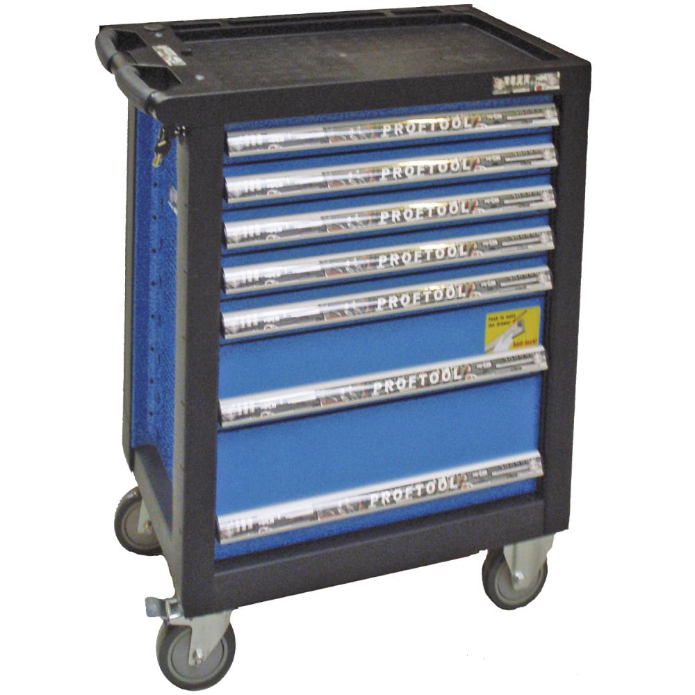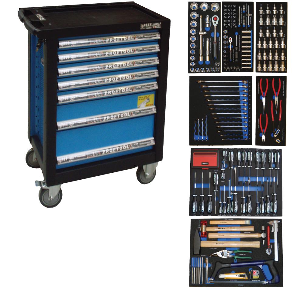 Værktøjsvogn med hjul og syv skuffer – heraf fire skuffer med i alt 260 værktøjsdele i EVA-skumindlæg. 1/2″ topnøglesæt: 6kt toppe kort 10 – 11 – 12 – 13 – 14 – 15 – 16 – 17 – 18 – 19 – 21 – 22 – 24 – 27 – 30 – 32 – 34 – 36 mm, forlænger 1/2″×125 mm – 1/2″×250 mm, T-grebs adapter, 1/2″ kardanled og 1/2″ skraldenøgle. 1/4″ topnøglesæt: 6kt toppe kort 4 – 4,5 – 5 – 5,5 – 6 – 7 – 8 – 9 – 10 – 11 – 12 – 13 – 14 mm, toppe lang 6 – 7 – 8 – 9 – 10 – 11 – 12 – 13 – 14 mm, stifttoppe 6kt 3 – 4 – 5 – 6 – 7 – 8 mm, Torx 10 – 15 – 20 – 25 – 30 – 40, PZ1 – PZ2, PH1 – PH2, kærv 5,5 mm, forlænger 1/4″×50 mm – 1/4″×100 mm, T-grebsglider, 1/4″ kardanled, 1/4″ tophåndtag og 1/4″ skraldenøgle. 1/2″ stifttopsæt: 6kt kort 5 – 6 – 7 – 8 – 9 – 10 – 12 – 14 – 17 – 19 mm, Torx kort 20 – 25 – 27 – 30 – 40 – 45 – 50 – 55 – 60, XZN kort M5 – M6 – M8 – M10 – M12 – M14 – M16 – M18. Mega skruetrækkersæt: Kærv 3,0 × 75 mm – 4,0 × 100 mm – 5,5 × 38 mm – 5,5 × 100 mm – 6,5 × 150 mm – 8,0 × 150 mm, PH0 × 75 mm – PH1 × 75 mm – PH2 × 38 mm – PH2 × 100 mm – PH3 × 150 mm – PZ1 × 75 mm – PZ2 × 100 mm – TX10 × 100 mm – TX15 × 100 mm – TX20 × 100 mm – TX25 × 100 mm – TX27 × 100 mm – TX30 × 100 mm – TX40 × 100 mm, topskruetrækker 7,0 × 125 mm – 8,0 × 125 mm – 10,0 × 125 mm, bitsskruetrækker 1/4″ × 125 mm, 100 dele bitssæt 1/4″. Ringgaffelnøglesæt: 6 – 7 – 8 – 9 – 10 – 11 – 12 – 13 – 14 – 15 – 16 – 17 – 18 – 19 – 20 – 21 – 22 – 24 mm. Tangsæt: sideafbider 160 mm, spidstang lige 200 mm, spidstang buet 200 mm, vandpumpetang 250 mm. Kombi-værktøjssæt: penhammer 435 g, smedehammer 1.500 g, plasthammer ø35 mm, nedstryger, hobbykniv 18 mm, båndmål 3 mm, ridsespids, teleskopmagnet, teleskopspejl, splituddriversæt 3-10 mm, pladesaks, skydelære 150 mm, og flad mejsel.