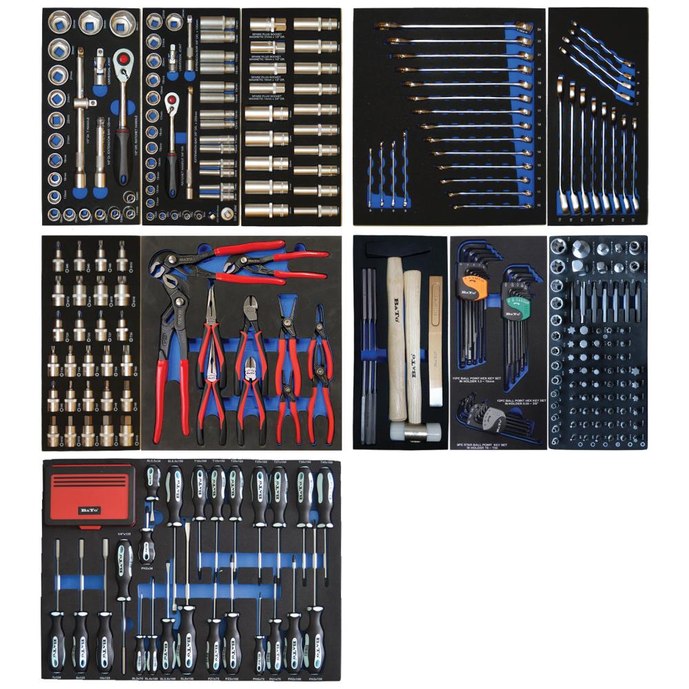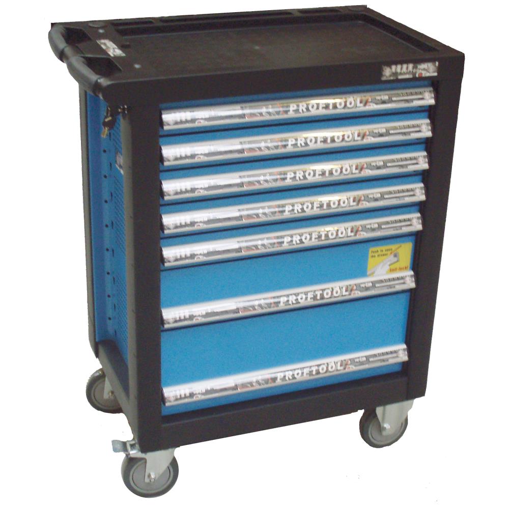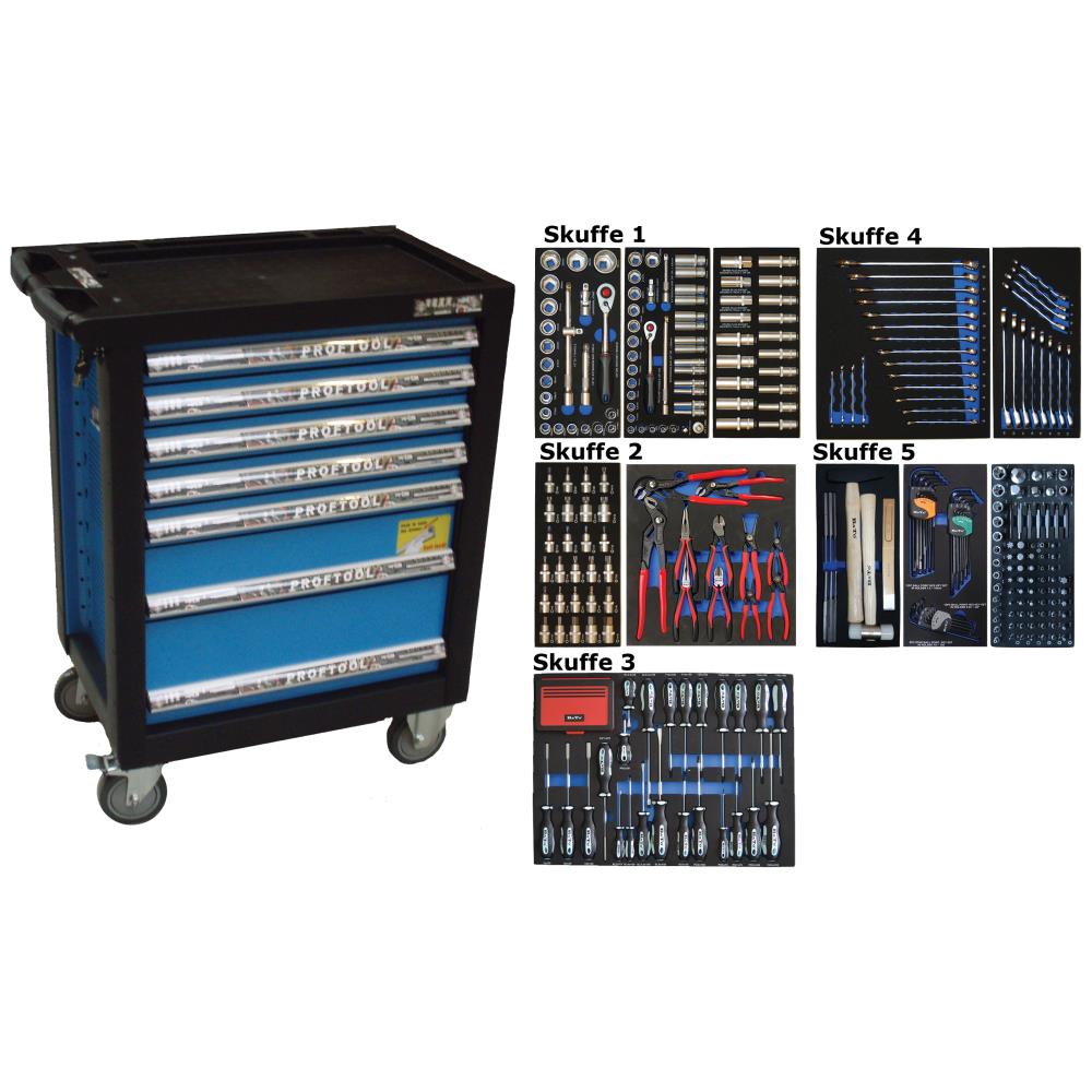 Værktøjsvogn med hjul og syv skuffer med i alt 404 værktøjsdele i EVA-skumindlæg. 1/2″ topnøglesæt: 6kt toppe kort 10 – 11 – 12 – 13 – 14 – 15 – 16 – 17 – 18 – 19 – 21 – 22 – 24 – 27 – 30 – 32 – 34 – 36 mm, forlænger 1/2″×125 mm – 1/2″×250 mm, T-grebs adapter, 1/2″ kardanled og 1/2″ skraldenøgle. 1/4″ topnøglesæt: 6kt toppe kort 4 – 4,5 – 5 – 5,5 – 6 – 7 – 8 – 9 – 10 – 11 – 12 – 13 – 14 mm, toppe lang 6 – 7 – 8 – 9 – 10 – 11 – 12 – 13 – 14 mm, stifttoppe 6kt 3 – 4 – 5 – 6 – 7 – 8 mm, Torx 10 – 15 – 20 – 25 – 30 – 40, PZ1 – PZ2, PH1 – PH2, kærv 5,5 mm, forlænger 1/4″×50 mm – 1/4″×100 mm, T-grebsglider, 1/4″ kardanled, 1/4″ tophåndtag og 1/4″ skraldenøgle. 1/2″ topsæt: 6kt toppe lang 10 – 11 – 12 – 13 – 14 – 15 – 16 – 17 – 18 – 19 – 20 – 21 – 22 – 23 – 24 mm, tændrørstoppe 1/2″ 16 – 18 – 21 mm og 3/8″ 14 mm. 1/2″ stifttopsæt: 6kt kort 5 – 6 – 7 – 8 – 9 – 10 – 12 – 14 – 17 – 19 mm, Torx kort 20 – 25 – 27 – 30 – 40 – 45 – 50 – 55 – 60, XZN kort M5 – M6 – M8 – M10 – M12 – M14 – M16 – M18. Tangsæt: sideafbider Softgrip 2k 160 mm og 180 mm, spidstang Softgrip 2k lige 200 mm og buet 200 mm, vandpumpetænger dyppet greb Quick-justering 175 mm – 250 mm – 300 mm, låseringstænger med kraftig spids A1 12-25 mm indv./lige, A2 19-60 mm indv./lige, J1 12-25 mm indv./lige og J2 19-60 mm indv./lige. Mega skruetrækkersæt: Kærv 3,0 × 75 mm – 4,0 × 100 mm – 5,5 × 38 mm – 5,5 × 100 mm – 6,5 × 150 mm – 8,0 × 150 mm, PH0 × 75 mm – PH1 × 75 mm – PH2 × 38 mm – PH2 × 100 mm – PH3 × 150 mm – PZ1 × 75 mm – PZ2 × 100 mm – TX10 × 100 mm – TX15 × 100 mm – TX20 × 100 mm – TX25 × 100 mm – TX27 × 100 mm – TX30 × 100 mm – TX40 × 100 mm, topskruetrækker 7,0 × 125 mm – 8,0 × 125 mm – 10,0 × 125 mm, bitsskruetrækker 1/4″ × 125 mm, 100 dele bitssæt 1/4″. Ringgaffelnøglesæt: 6 – 7 – 8 – 9 – 10 – 11 – 12 – 13 – 14 – 15 – 16 – 17 – 18 – 19 – 20 – 21 – 22 – 24 mm. Ringskraldenøglesæt: 8 – 9 – 10 – 11 – 12 – 13 – 14 – 15 – 16 – 17 – 18 – 19 mm. Hammersæt: bænkhammer 500 g, nylonhammer ø35 mm, dornsæt 3 – 4 – 5 – 6 – 8 – 10 mm og fladmejsel 230×25 mm. Stiftnøgler: 1,5 – 2 – 2,5 – 3 – 4 – 5 – 6 – 7 – 8 – 9 – 10 mm, tommer 0,05 – 1/16 – 5/64 – 3/32 – 7/64 – 1/8 – 9/64 – 5/32 – 3/16 – 7/32 – 1/4 – 5/16 – 3/8″, og Torx 8 – 10 – 15 – 20 – 25 – 27 – 30 – 40 – 50. Auto/E-toppe/Adaptersæt.