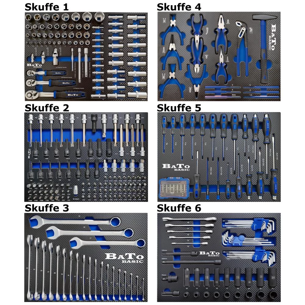 Basic værktøjsvogn med endeskab og 7 skuffer – heraf 6 med i alt 358 værktøjsdele. Skuffe 1 indeholder: 1/4″ toppe kort (4-4,5-5-5,5-6-7-8-9-10-11-12-13-14 mm), 1/4″ toppe lang (4-5,5-5-5,5-6-7-8-9-10-11-12-13 mm), 3/8″ toppe kort (10-11-12-13-14-15-16-17-18-19 mm), 3/8” toppe lang (8-10-11-12-13-14-15-16-17-18-19 mm), 1/2″ toppe kort (10-11-12-13-14-15-16-17-18-19-20-21-22-24-27-30-32 mm), 1/2″ toppe lang (10-13-15-19-22-24 mm), kardanled 1/4-3/8-1/2″, forlænger 1/4″×100 mm, 3/8″×150 mm, 1/2”×125 mm, og skraldenøgle 1/4-3/8-1/2″ 72-tands. Skuffe 2 indeholder: 30 mm lange 1/4″ bits (kærv 8-10-12 mm, PH3-4, PZ3-4, 6kt 7-8-10-12-14 mm, Torx 40-45-50-55-60-70, Torx tamper med hul 40-45-50-55-60-70), 1/4″ stifttoppe (kærv 4-5,5-6,5-7 mm, PH0-1-2-3, PZ0-1-2-3, XZN M8-M10-M12, 6kt 3-4-5-6-7-8 mm, Torx 8-9-10-15-20-25-27-30-40, Torx tamper med hul 8-9-10-15-20–25-27-30-40, Torx 5 edge TS med hul 10-15-20-25-27-30-40-45-50), 1/2″ stifttoppe (Torx 40-45-50-55-60-70×140 mm, 6kt 10-11-13×140mm 14-17-19-22-24×55mm, XZN M10-12-14-16×140 mm), bitsadapter 8 mm × 1/2″, Pneumatic top M18×78 mm, og krafttoppe (6kt 5-6-8-10-12-14-17-19 mm, Torx 30-40-45-50-55-60-70-80). Skuffe 3 indeholder: ringgaffelnøgler (6-7-8-9-10-11-12-13-14-15-16-17-18-19-20-21-22-23-24-27-30-32 mm). Skuffe 4 indeholder: hammer 300 g, dorne (1,5-2-3-4-5-6 mm), vandpumpetang 250 mm, kombitang 175 mm, spidstang lige 150 mm, spidstang buet 150 mm, sideafbider 150 mm, 2× låseringstang lige, og 2× låseringstang buet. Skuffe 5 indeholder: skruetrækkere ligekærv (4×100 mm, 5×75 mm, 6×100 mm, 8×150 mm), skruetrækkere Phillips (PH1×75 mm, PH2×100 mm, PH3×150 mm), juvelerskruetrækkere ligekærv (3×75 mm, 2,5×100 mm), juvelerskruetrækker Phillips (PH0×100 mm), skruetrækkere Torx (9-10-15-20-25-27-30-40), bitsskruetrækker og bitssæt med 49 dele. Skuffe 6 indeholder: ringskraldnøgler (10-13-15-17-19 mm), stiftnøglesæt med kugle (1,5-10 mm), stiftnøglesæt med kugle (1/16″-3/8″), stiftnøglesæt (Torx 10-50), 1/2″ krafttoppe kort (10-11-13-15-17-19-21-22-24 mm), 1/2″ krafttoppe lang (10-11-13-15-17-19-21-22-24 mm), forlængere 75-125-250 mm og kardanled. Vognen har fire drejelige hjul – heraf to med bremse.