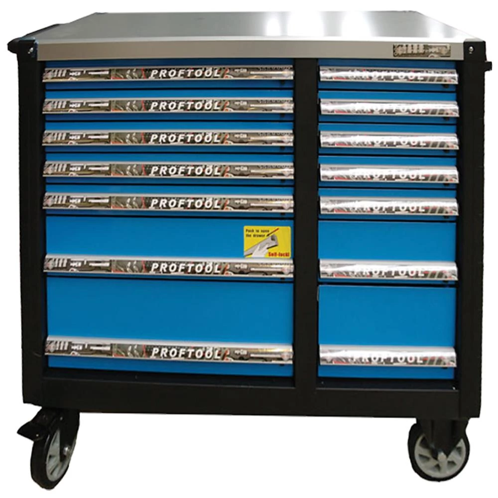 Værktøjsvogn med hjul og 14 skuffer med i alt 506 værktøjsdele i EVA-skumindlæg. 1/2″ topnøglesæt: 6kt toppe kort 10 – 11 – 12 – 13 – 14 – 15 – 16 – 17 – 18 – 19 – 21 – 22 – 24 – 27 – 30 – 32 – 34 – 36 mm, forlænger 1/2″×125 mm – 1/2″×250 mm, T-grebs adapter, 1/2″ kardanled og 1/2″ skraldenøgle. 3/8″ topnøglesæt: 6kt toppe kort 6 – 7 – 8 – 9 – 10 – 11 – 12 – 13 – 14 – 15 – 16 – 17 – 18 – 19 – 20 – 21 – 22 – 24 mm, toppe lang 6 – 7 – 8 – 9 – 10 – 11 – 12 – 13 – 14 – 15 – 16 – 17 – 18 – 19 mm, forlænger 3/8″×43 mm – 3/8″×100 mm – 3/8″×200 mm, T-grebs adapter, 3/8″ kardanled og 3/8″ skraldenøgle. 1/4″ topnøglesæt: 6kt toppe kort 4 – 4,5 – 5 – 5,5 – 6 – 7 – 8 – 9 – 10 – 11 – 12 – 13 – 14 mm, toppe lang 6 – 7 – 8 – 9 – 10 – 11 – 12 – 13 – 14 mm, stifttoppe 6kt 3 – 4 – 5 – 6 – 7 – 8 mm, Torx 10 – 15 – 20 – 25 – 30 – 40, PZ1 – PZ2, PH1 – PH2, kærv 5,5 mm, forlænger 1/4″×50 mm – 1/4″×100 mm, T-grebsglider, 1/4″ kardanled, 1/4″ tophåndtag og 1/4″ skraldenøgle. 1/2″ stifttopsæt: 6kt kort 5 – 6 – 7 – 8 – 9 – 10 – 12 – 14 – 17 – 19 mm, Torx kort 20 – 25 – 27 – 30 – 40 – 45 – 50 – 55 – 60, XZN kort M5 – M6 – M8 – M10 – M12 – M14 – M16 – M18. 1/2″ topsæt: 6kt toppe lang 10 – 11 – 12 – 13 – 14 – 15 – 16 – 17 – 18 – 19 – 20 – 21 – 22 – 23 – 24 mm, tændrørstoppe 1/2″ 16 – 18 – 21 mm og 3/8″ 14 mm. 1/2″ stifttopsæt: 6kt lang 5 – 6 – 7 – 8 – 10 – 12 – 14 – 17 – 19 mm, Torx lang 20 – 25 – 30 – 40 – 45 – 50 – 55 – 60. 1/2″ krafttopsæt: 6kt toppe kort 10 – 11 – 12 – 13 – 14 – 15 – 16 – 17 – 18 – 19 – 21 – 22 – 23 – 24 mm, toppe lang med plastbeskytter 17 – 19 – 21 mm, forlænger 1/2″×125 mm og 1/2″ kardanled. Auto/E-toppe/Adaptersæt. Dobbelt lednøglesæt: 8×9 – 10×11 – 12×13 – 14×15 – 16×17 – 18×19 mm. Ringskraldenøglesæt: 8 – 9 – 10 – 11 – 12 – 13 – 14 – 15 – 16 – 17 – 18 – 19 mm. Værktøjssæt med skiftenøgler 6″ – 8″ og svejsetænger 5″ – 10″. Stiftnøglesæt: T-greb 2 – 3 – 4 – 5 – 6 – 8 mm, kniv 1,5-8 mm, sæt 1,5 – 2 – 2,5 – 3 – 4 – 5 – 6 – 7 – 8 – 9 – 10 mm. Mega skruetrækkersæt: Kærv 3,0 × 75 mm – 4,0 × 100 mm – 5,5 × 38 mm – 5,5 × 100 mm – 6,5 × 150 mm – 8,0 × 150 mm, PH0 × 75 mm – PH1 × 75 mm – PH2 × 38 mm – PH2 × 100 mm – PH3 × 150 mm – PZ1 × 75 mm – PZ2 × 100 mm – TX10 × 100 mm – TX15 × 100 mm – TX20 × 100 mm – TX25 × 100 mm – TX27 × 100 mm – TX30 × 100 mm – TX40 × 100 mm, topskruetrækker 7,0 × 125 mm – 8,0 × 125 mm – 10,0 × 125 mm, bitsskruetrækker 1/4″ × 125 mm, 100 dele bitssæt 1/4″. Ringgaffelnøglesæt: 6 – 7 – 8 – 9 – 10 – 11 – 12 – 13 – 14 – 15 – 16 – 17 – 18 – 19 – 20 – 21 – 22 – 24 – 27 – 30 – 32 – 32 – 34 – 36 mm. Filesæt: Flad, rund, firkant, buet og trekant. Tangsæt: sideafbider 160 mm, spidstang lige 200 mm, spidstang buet 200 mm, vandpumpetang 250 mm. Låseringstangsæt: J1 12-25 mm indv./lige, J2 19-60 mm indv./lige, A1 10-25 mm udv./lige og A2 19-60 mm udv./lige. Kombi-værktøjssæt: penhammer 435 g, smedehammer 1.500 g, plasthammer ø35 mm, nedstryger, hobbykniv 18 mm, båndmål 3 mm, ridsespids, teleskopmagnet, teleskopspejl, splituddriversæt 3-10 mm, pladesaks, skydelære 150 mm, og flad mejsel. Kombi-værktøjssæt: momentnøgle 1/2″ 20-200 Nm, håndnittetang 2,4-5,0 mm, vandpumpetang 400 mm, ledgreb 1/2″ 600 mm, stålbørste smal, kabelskotang og brækjern 8-12-18″. 7 stk. tomme EVA-skumindlæg med to rum til diverse skruer og værktøj.