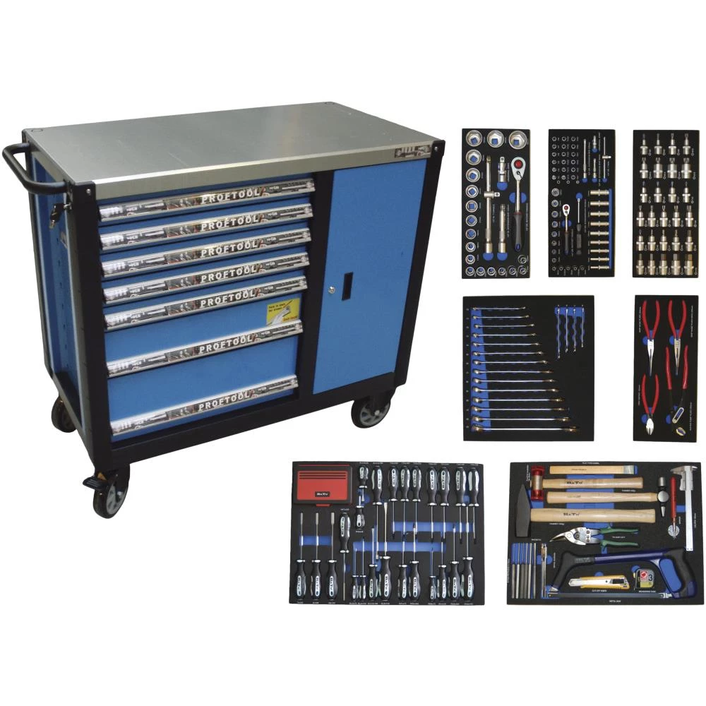 Værktøjsvogn XXL med hjul, skab med to hylder og syv skuffer – heraf fire skuffer med i alt 260 værktøjsdele i EVA-skumindlæg. 1/2″ topnøglesæt: 6kt toppe kort 10 – 11 – 12 – 13 – 14 – 15 – 16 – 17 – 18 – 19 – 21 – 22 – 24 – 27 – 30 – 32 – 34 – 36 mm, forlænger 1/2″×125 mm – 1/2″×250 mm, T-grebs adapter, 1/2″ kardanled og 1/2″ skraldenøgle. 1/4″ topnøglesæt: 6kt toppe kort 4 – 4,5 – 5 – 5,5 – 6 – 7 – 8 – 9 – 10 – 11 – 12 – 13 – 14 mm, toppe lang 6 – 7 – 8 – 9 – 10 – 11 – 12 – 13 – 14 mm, stifttoppe 6kt 3 – 4 – 5 – 6 – 7 – 8 mm, Torx 10 – 15 – 20 – 25 – 30 – 40, PZ1 – PZ2, PH1 – PH2, kærv 5,5 mm, forlænger 1/4″×50 mm – 1/4″×100 mm, T-grebsglider, 1/4″ kardanled, 1/4″ tophåndtag og 1/4″ skraldenøgle. 1/2″ stifttopsæt: 6kt kort 5 – 6 – 7 – 8 – 9 – 10 – 12 – 14 – 17 – 19 mm, Torx kort 20 – 25 – 27 – 30 – 40 – 45 – 50 – 55 – 60, XZN kort M5 – M6 – M8 – M10 – M12 – M14 – M16 – M18. Mega skruetrækkersæt: Kærv 3,0 × 75 mm – 4,0 × 100 mm – 5,5 × 38 mm – 5,5 × 100 mm – 6,5 × 150 mm – 8,0 × 150 mm, PH0 × 75 mm – PH1 × 75 mm – PH2 × 38 mm – PH2 × 100 mm – PH3 × 150 mm – PZ1 × 75 mm – PZ2 × 100 mm – TX10 × 100 mm – TX15 × 100 mm – TX20 × 100 mm – TX25 × 100 mm – TX27 × 100 mm – TX30 × 100 mm – TX40 × 100 mm, topskruetrækker 7,0 × 125 mm – 8,0 × 125 mm – 10,0 × 125 mm, bitsskruetrækker 1/4″ × 125 mm, 100 dele bitssæt 1/4″. Ringgaffelnøglesæt: 6 – 7 – 8 – 9 – 10 – 11 – 12 – 13 – 14 – 15 – 16 – 17 – 18 – 19 – 20 – 21 – 22 – 24 mm. Tangsæt: sideafbider 160 mm, spidstang lige 200 mm, spidstang buet 200 mm, vandpumpetang 250 mm. Kombi-værktøjssæt: penhammer 435 g, smedehammer 1.500 g, plasthammer ø35 mm, nedstryger, hobbykniv 18 mm, båndmål 3 mm, ridsespids, teleskopmagnet, teleskopspejl, splituddriversæt 3-10 mm, pladesaks, skydelære 150 mm, og flad mejsel.