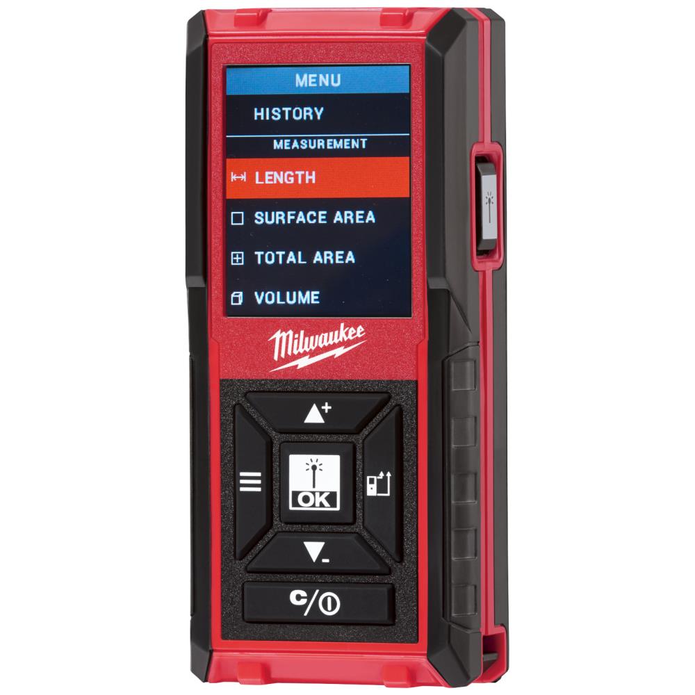 Ultra kompakt laserafstandsmåler. Kan måle afstande mellem 0,15 og 45 mtr med +/– 1,5 mm præcision. Måleknap både på front og på siden. Kan fåretage enkeltmålinger samt løbende målinger. Med funktioner som afstand, areal, volume, overflademålinger, +/-, samt løbende målinger. Stort og overskueligt LCD-display med 3 linjer og i farver. Udklappeligt endestykke til opmåling fra kanter eller hjørner. Vægt 110 gram. IP54-beskyttelse. Leveres i nylon-etui med 2 stk AAA batterier.