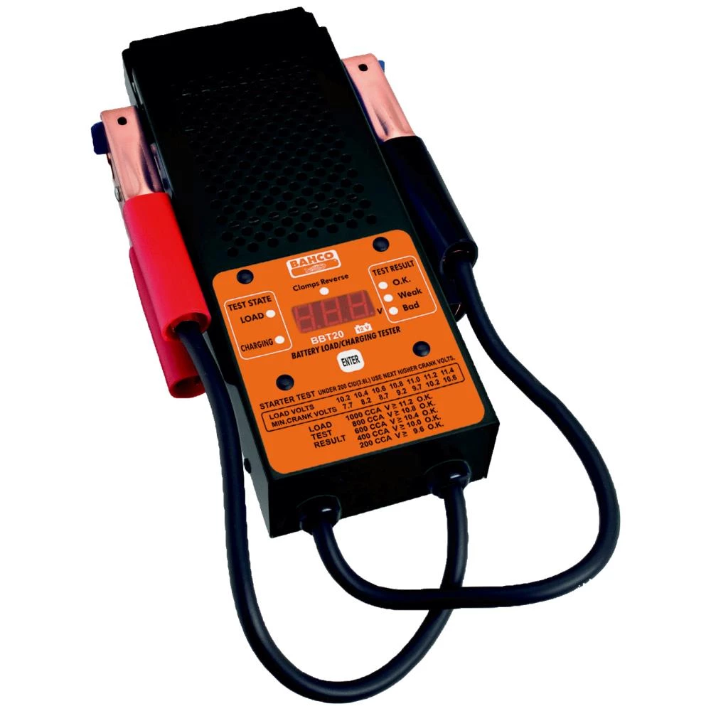 12 V digital batteriopladnings- og opladningssystemtester. Angiver batteristatus med tre forskellige aflæsninger hhv. OK, SVAG eller DÅRLIG. Mulighed for at teste køretøjets generator. Kontrol af omvendt polaritet med alarmfunktion. Arbejdsområde fra 200 op til 1.000 CCA. Inkl. 50 cm lange kabler.
