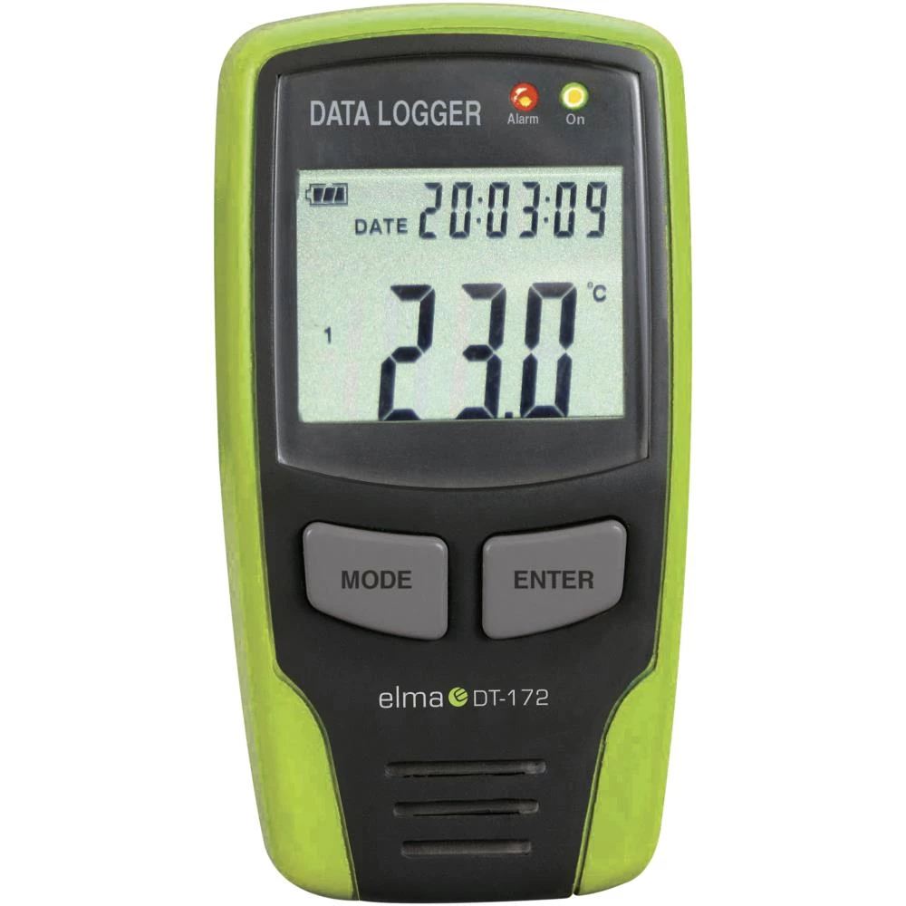 Elma DT-172 er en smart datalogger med indbygget føler for både temperatur og luftfugtighed. Alle værdier vises direkte på displayet med angivelse af både øjebliksværdi, tid, dato samt maksimum og minimum. Loggeren har mange anvendelsesmuligheder som f.eks. overvågning af lokaler, kølediske, fødevarer, transport m.m. Elma DT-172 har indbygget real time ur og kan gemme 16.000 sæt målinger i hukommelsen. Dataloggeren programmeres let og hurtigt via USB kommunikationen med mulighed for at vælge logningsinterval, antal målinger samt programmere alarmer. Alle målinger kan overføres til PC for kontrol og dokumentation. Elma DT-172 startes ved et simpelt tastetryk. Aktiv datalogning samt alarm indikeres med lysdioder. Dataloggeren leveres inkl. låsbart væg monteringsbeslag, software, USB-kabel, vejledning og batteri.